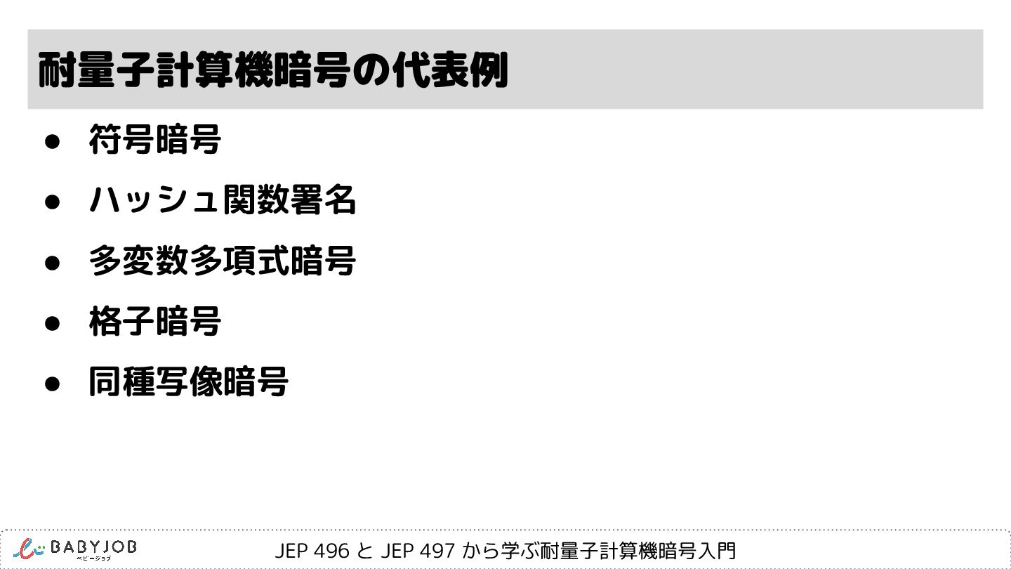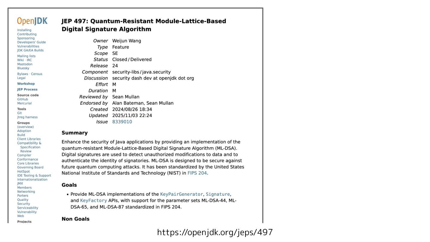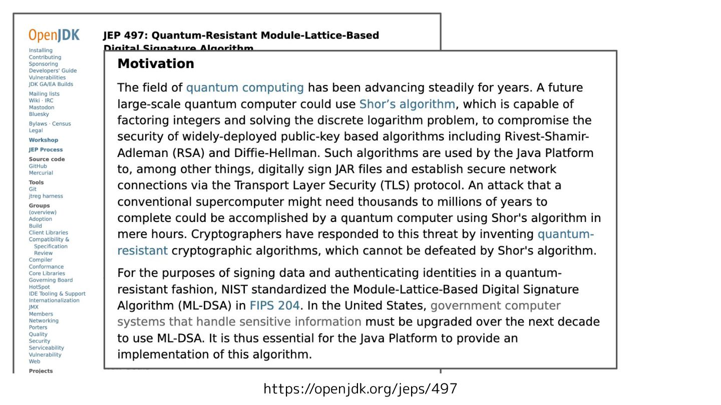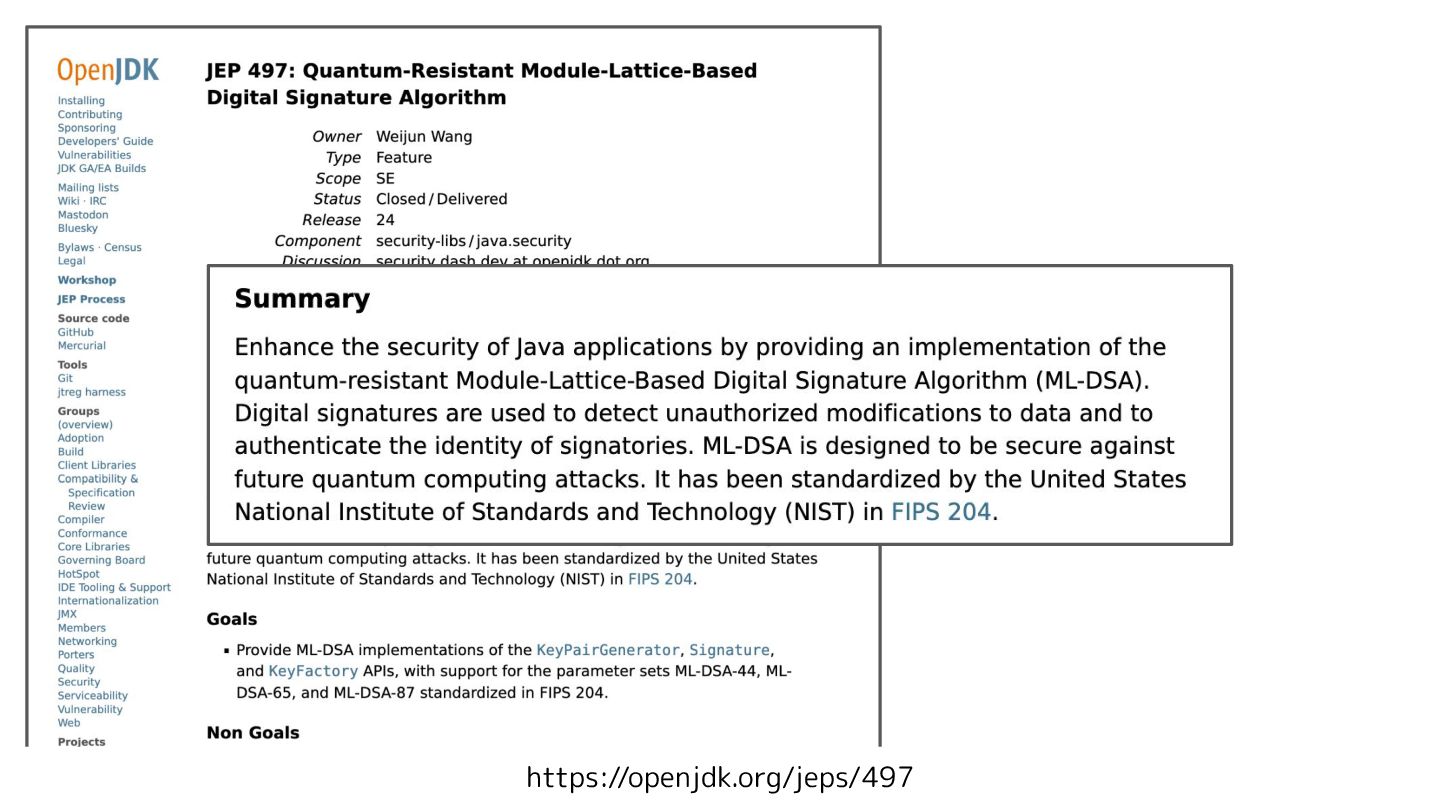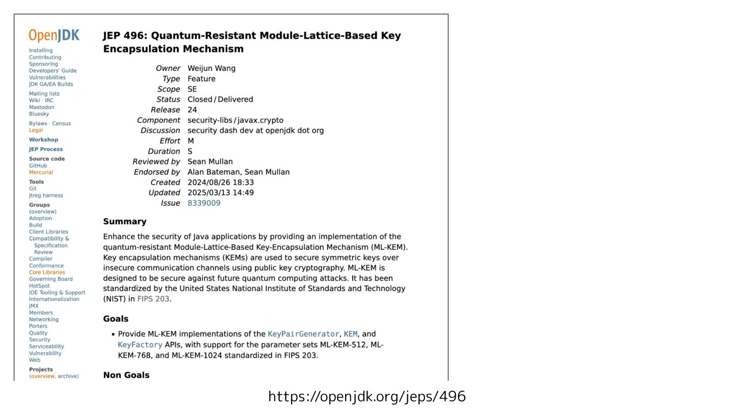 203 ◦ ML-KEM(Module-Lattice-Based Key-Encapsulation Mechanism) ◦ 格子暗号の鍵交換アルゴリズムのCRYSTALS-Kyberがベース • FIPS 204 ◦ ML-DSA(Module-Lattice-Based Digital Signature Algorithm) ◦ 格子暗号の電子署名アルゴリズムのCRYSTALS-Dilithiumがベース • FIPS 205 ◦ SLH-DSA(Stateless Hash-Based Digital Signature Algorithm ◦ ハッシュ関数の電子署名アルゴリズムのSPHINCS+がベース ◦ ML-DSAが脆弱であると判明した場合のバックアップ