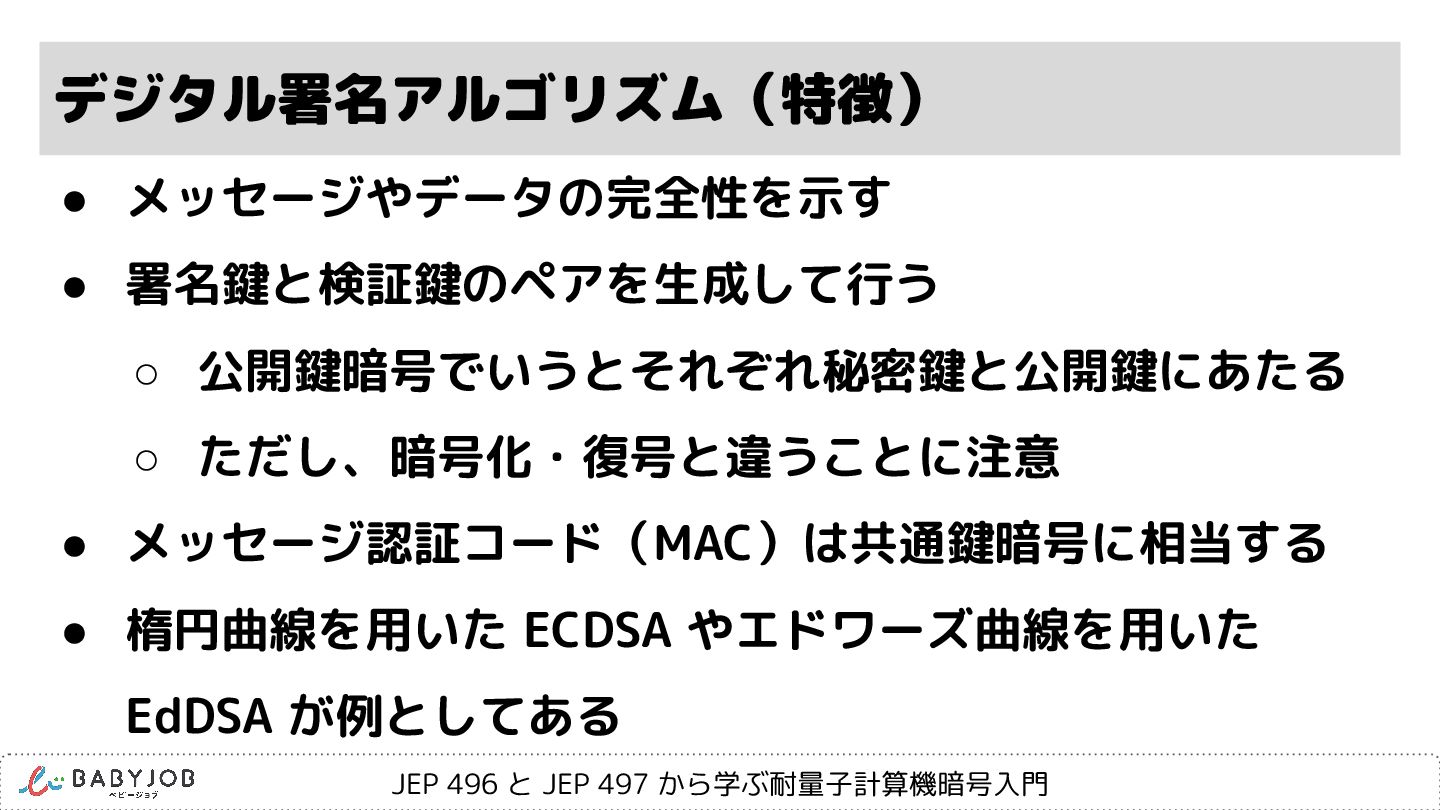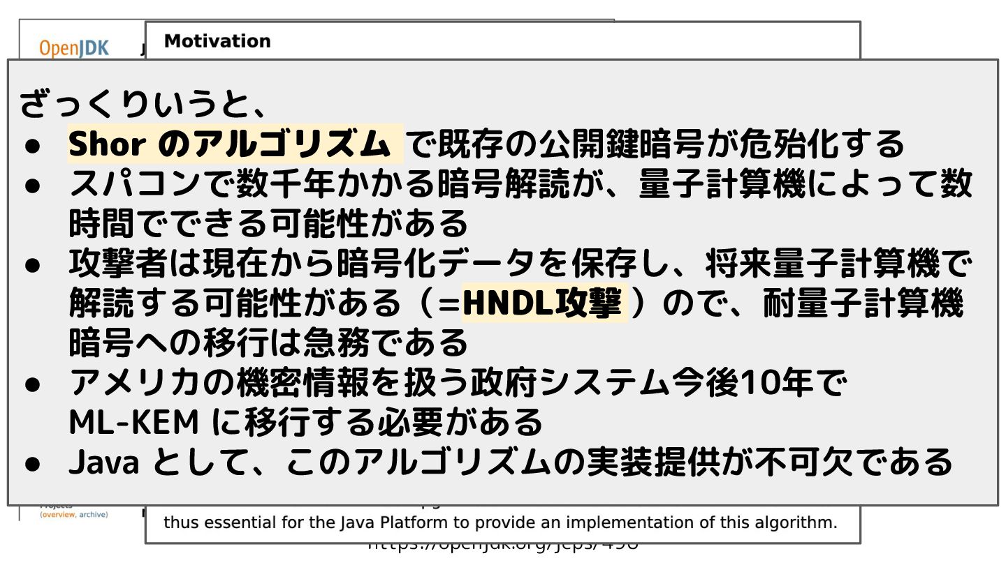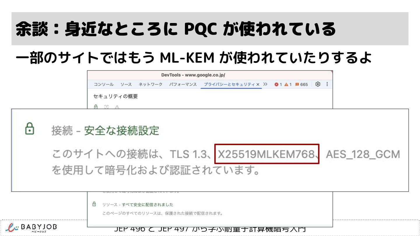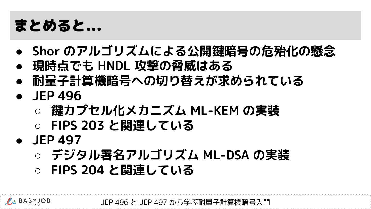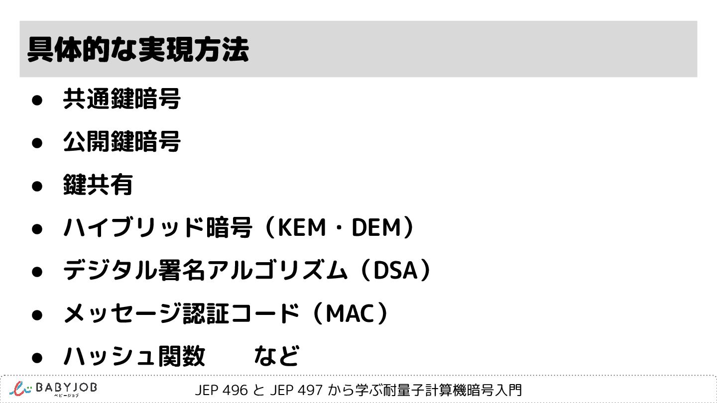 203 ◦ ML-KEM(Module-Lattice-Based Key-Encapsulation Mechanism) ◦ 格子暗号の鍵交換アルゴリズムのCRYSTALS-Kyberがベース • FIPS 204 ◦ ML-DSA(Module-Lattice-Based Digital Signature Algorithm) ◦ 格子暗号の電子署名アルゴリズムのCRYSTALS-Dilithiumがベース • FIPS 205 ◦ SLH-DSA(Stateless Hash-Based Digital Signature Algorithm ◦ ハッシュ関数の電子署名アルゴリズムのSPHINCS+がベース ◦ ML-DSAが脆弱であると判明した場合のバックアップ