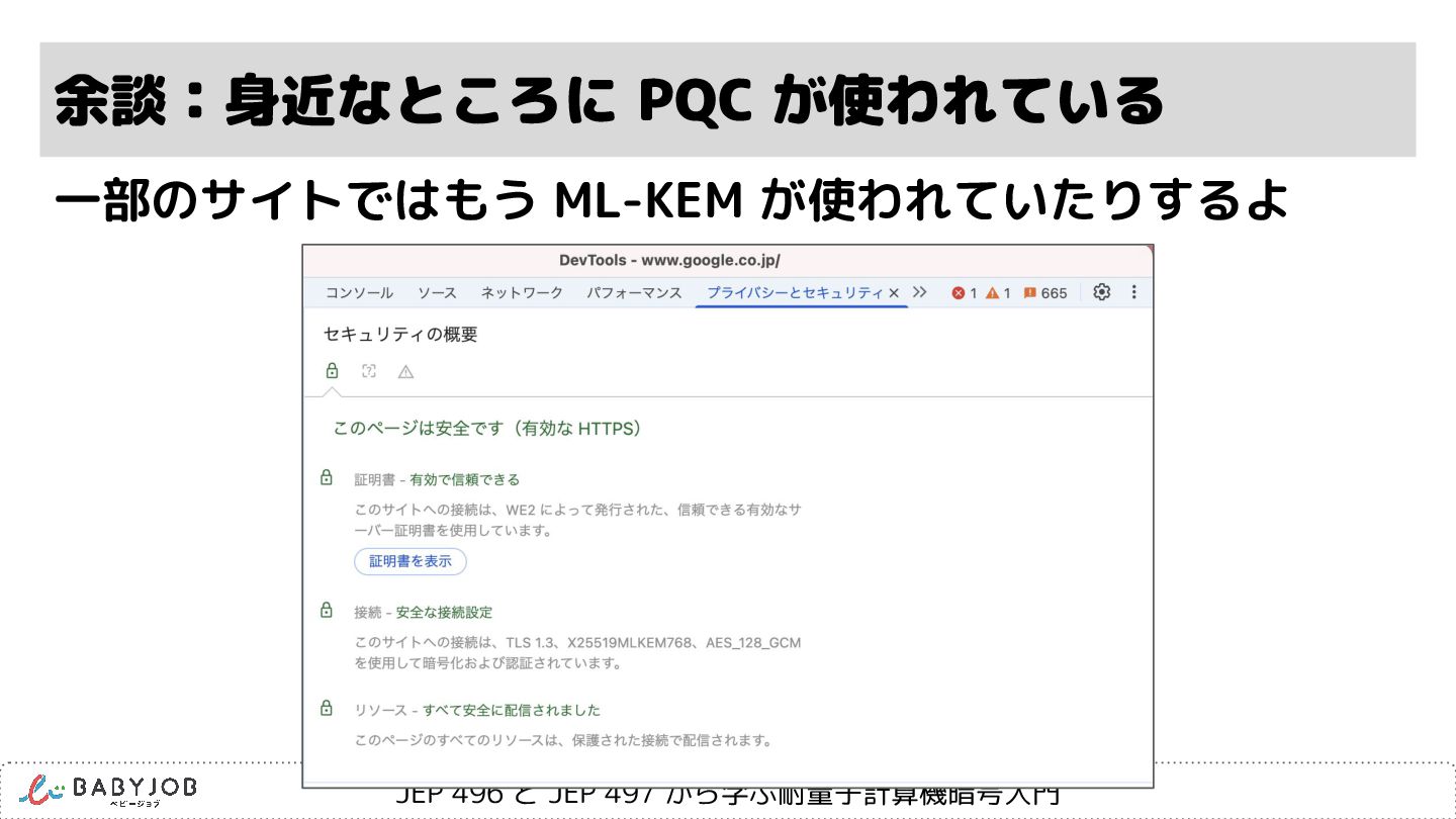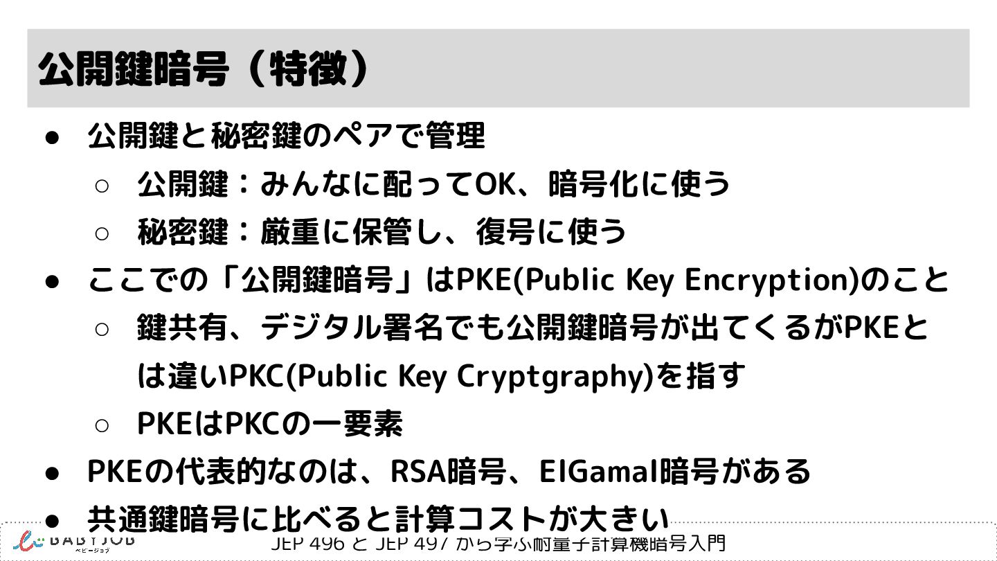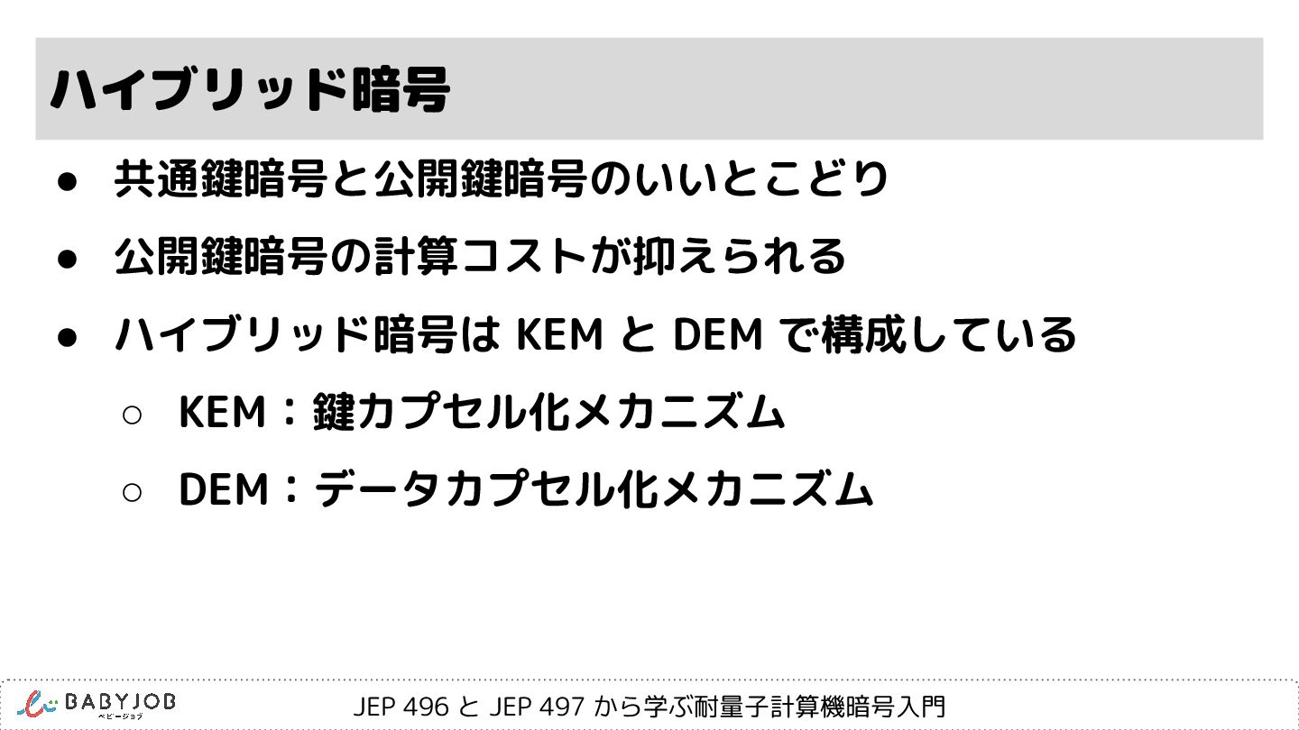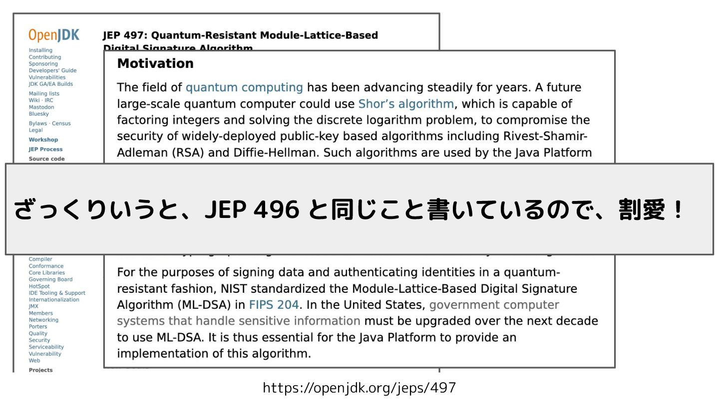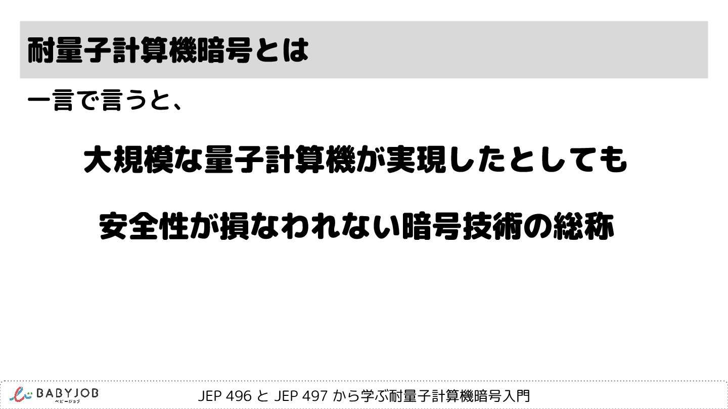 203 ◦ ML-KEM(Module-Lattice-Based Key-Encapsulation Mechanism) ◦ 格子暗号の鍵交換アルゴリズムのCRYSTALS-Kyberがベース • FIPS 204 ◦ ML-DSA(Module-Lattice-Based Digital Signature Algorithm) ◦ 格子暗号の電子署名アルゴリズムのCRYSTALS-Dilithiumがベース • FIPS 205 ◦ SLH-DSA(Stateless Hash-Based Digital Signature Algorithm ◦ ハッシュ関数の電子署名アルゴリズムのSPHINCS+がベース ◦ ML-DSAが脆弱であると判明した場合のバックアップ