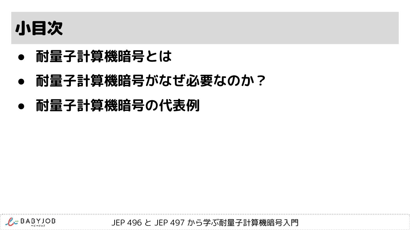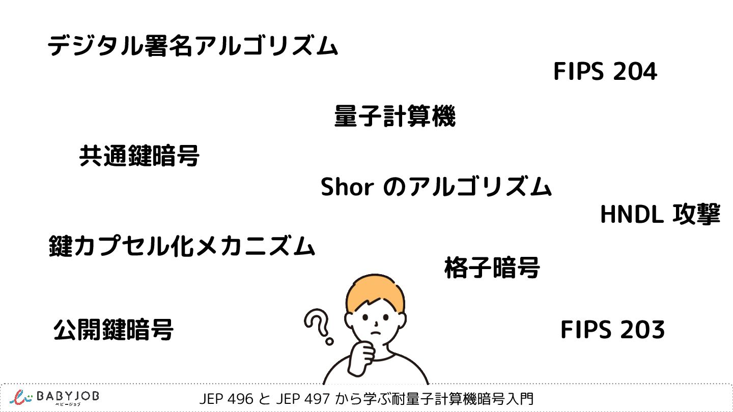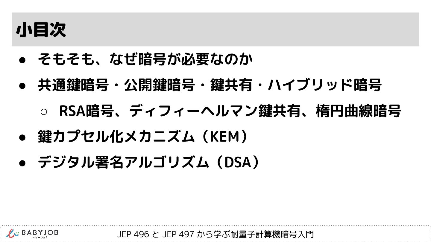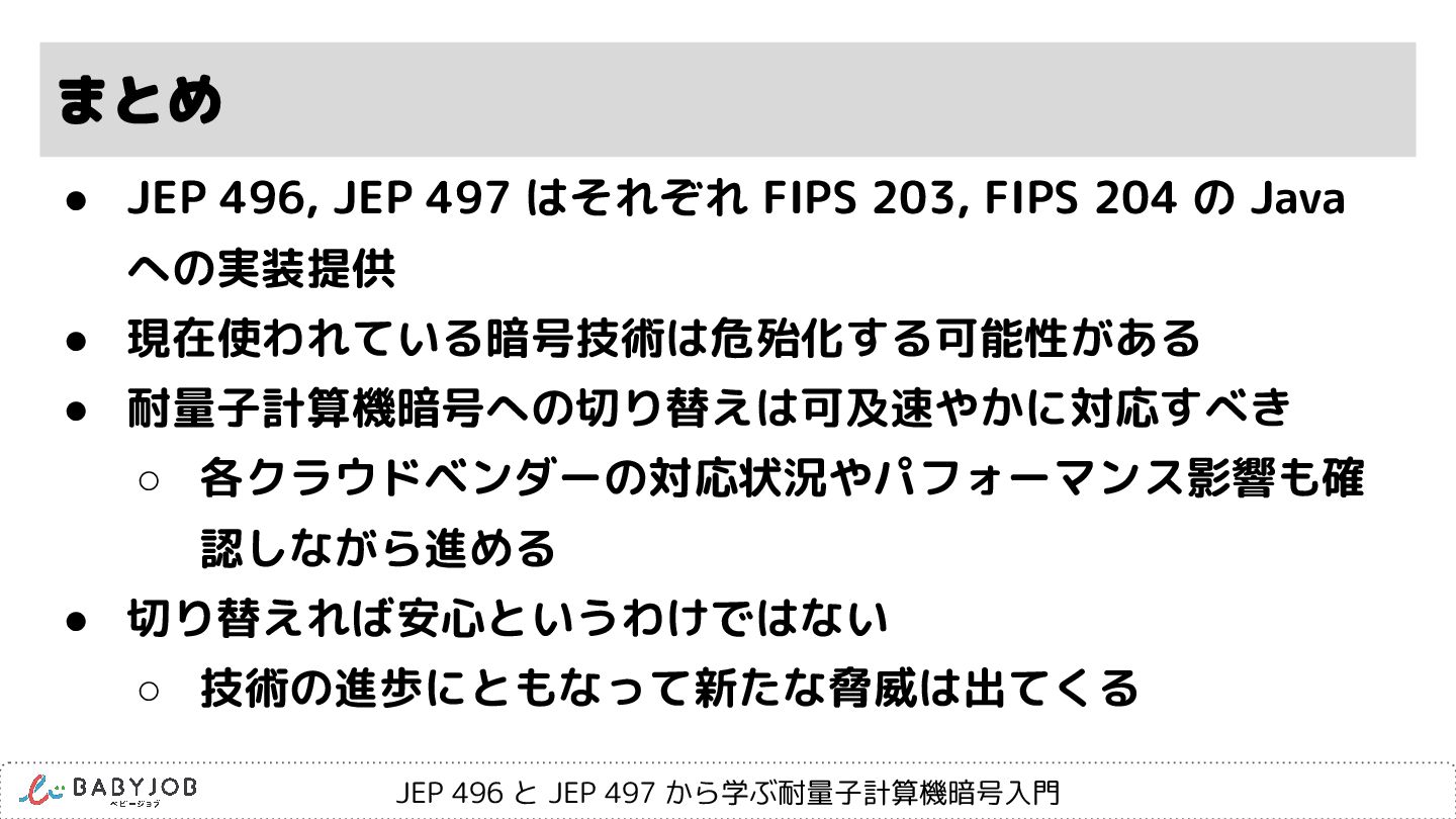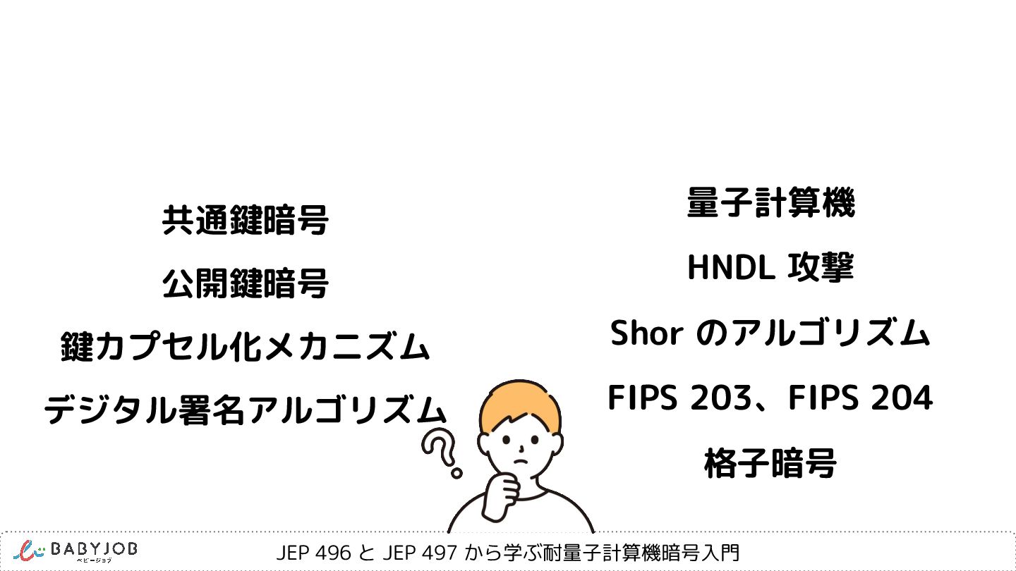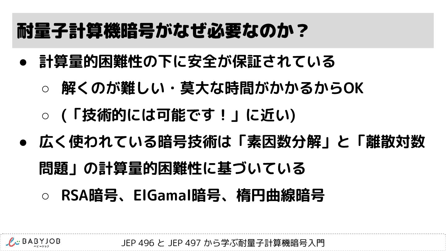 203 ◦ ML-KEM(Module-Lattice-Based Key-Encapsulation Mechanism) ◦ 格子暗号の鍵交換アルゴリズムのCRYSTALS-Kyberがベース • FIPS 204 ◦ ML-DSA(Module-Lattice-Based Digital Signature Algorithm) ◦ 格子暗号の電子署名アルゴリズムのCRYSTALS-Dilithiumがベース • FIPS 205 ◦ SLH-DSA(Stateless Hash-Based Digital Signature Algorithm ◦ ハッシュ関数の電子署名アルゴリズムのSPHINCS+がベース ◦ ML-DSAが脆弱であると判明した場合のバックアップ