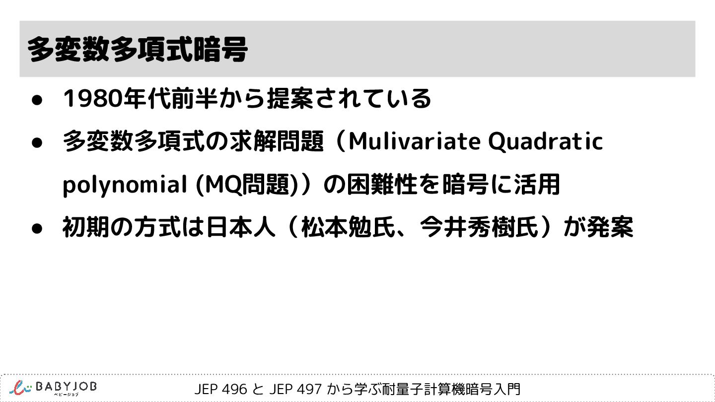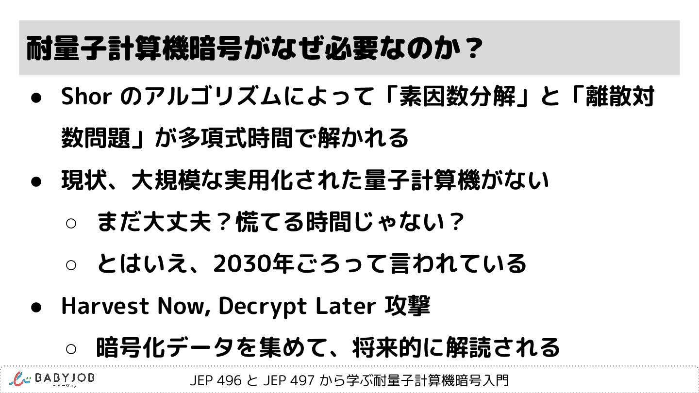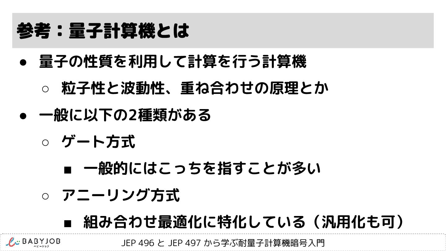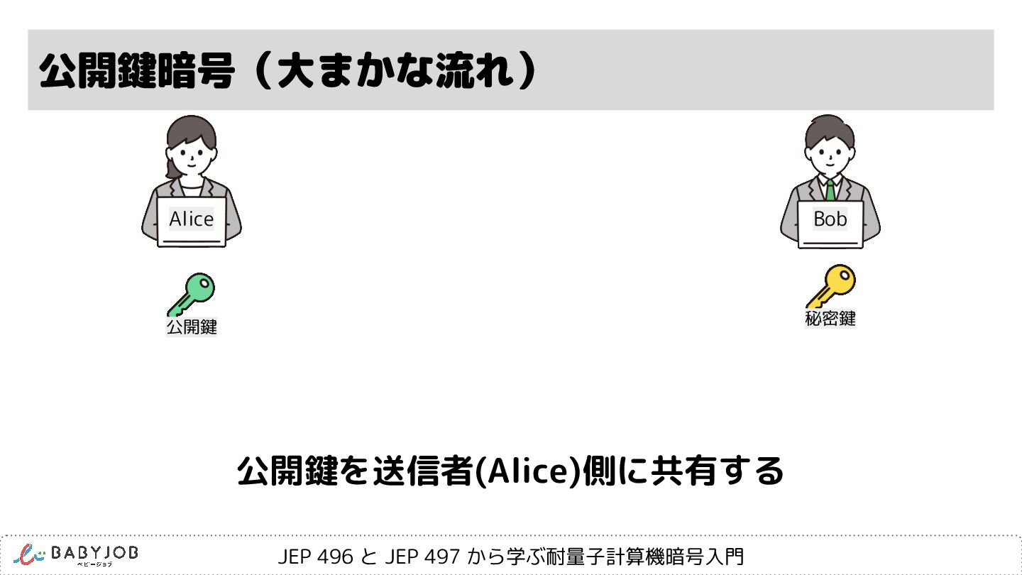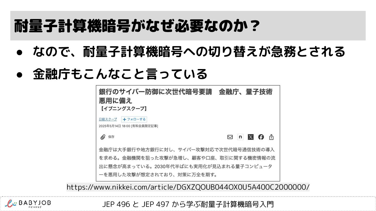 203 ◦ ML-KEM(Module-Lattice-Based Key-Encapsulation Mechanism) ◦ 格子暗号の鍵交換アルゴリズムのCRYSTALS-Kyberがベース • FIPS 204 ◦ ML-DSA(Module-Lattice-Based Digital Signature Algorithm) ◦ 格子暗号の電子署名アルゴリズムのCRYSTALS-Dilithiumがベース • FIPS 205 ◦ SLH-DSA(Stateless Hash-Based Digital Signature Algorithm ◦ ハッシュ関数の電子署名アルゴリズムのSPHINCS+がベース ◦ ML-DSAが脆弱であると判明した場合のバックアップ