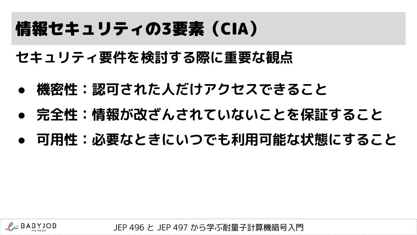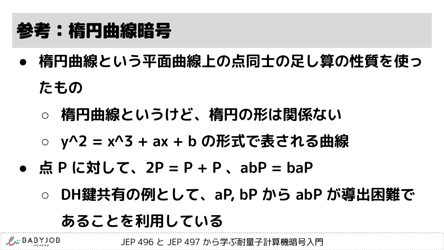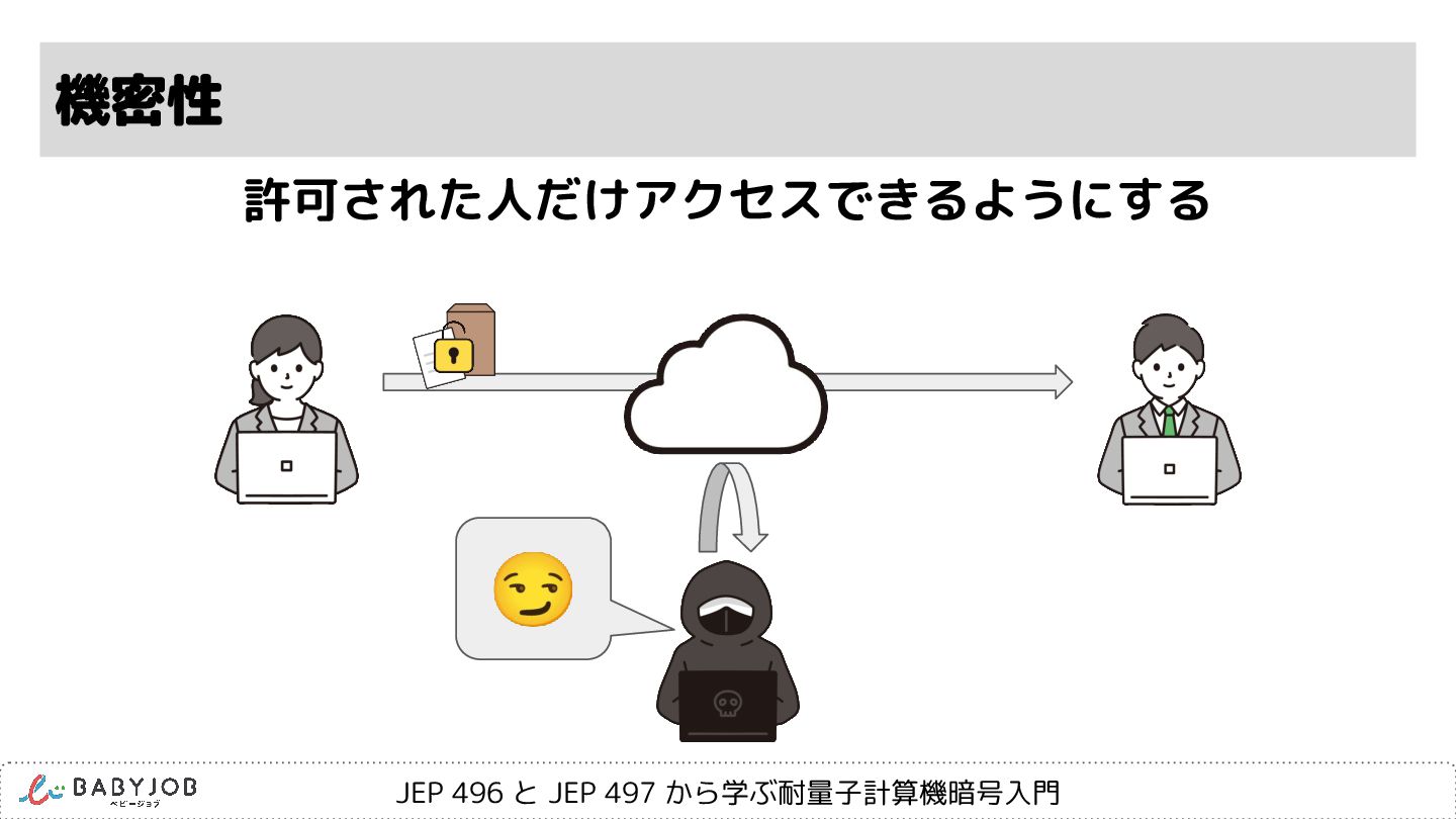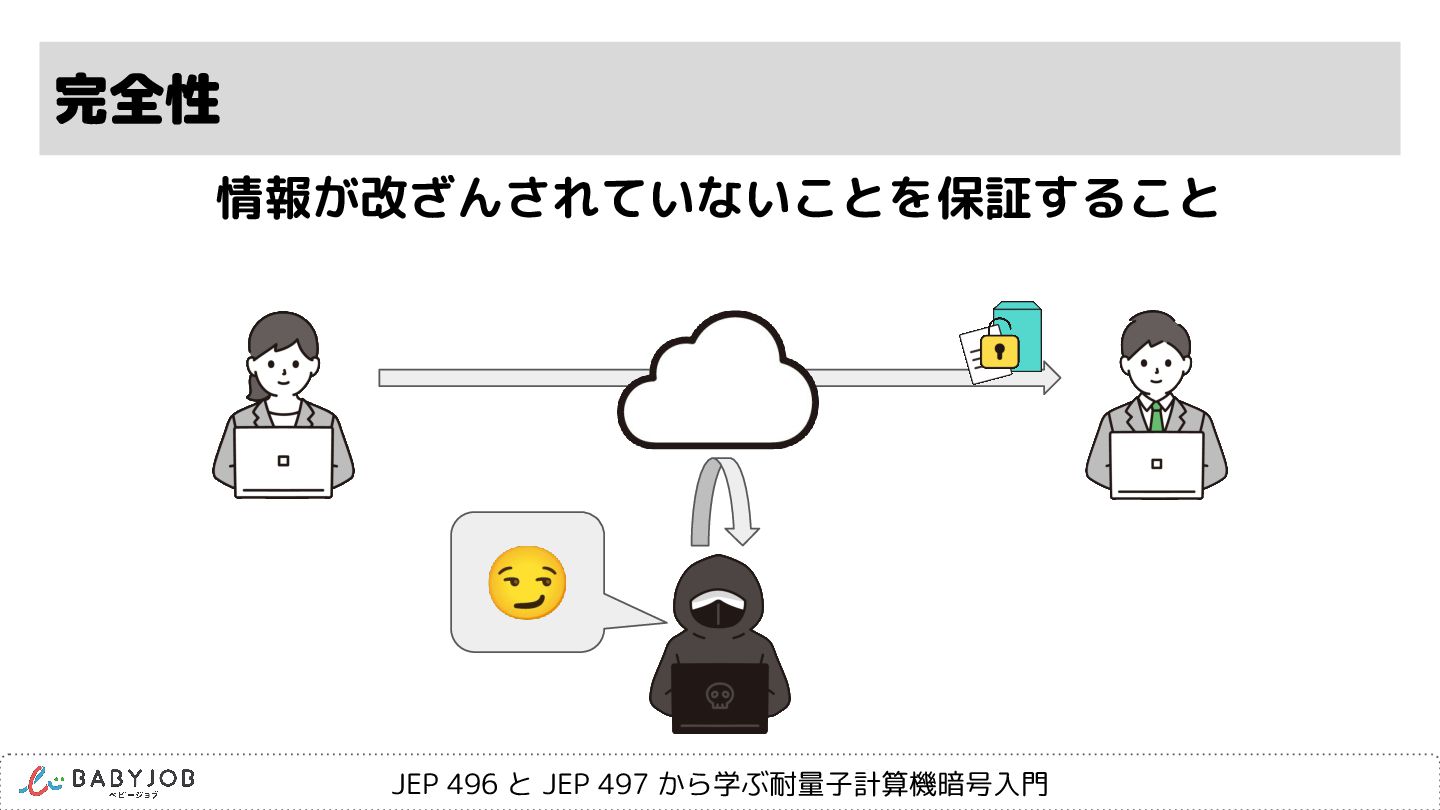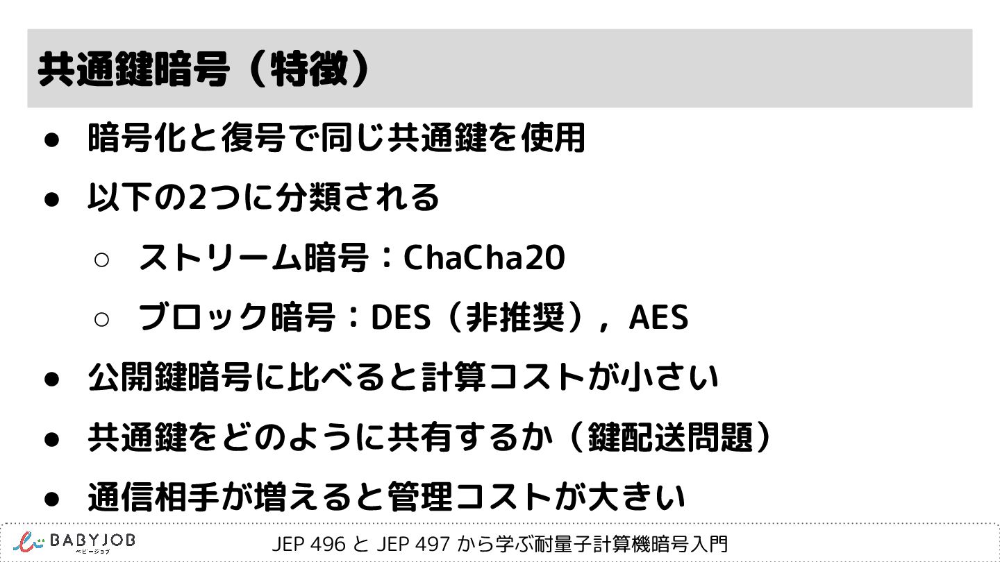 203 ◦ ML-KEM(Module-Lattice-Based Key-Encapsulation Mechanism) ◦ 格子暗号の鍵交換アルゴリズムのCRYSTALS-Kyberがベース • FIPS 204 ◦ ML-DSA(Module-Lattice-Based Digital Signature Algorithm) ◦ 格子暗号の電子署名アルゴリズムのCRYSTALS-Dilithiumがベース • FIPS 205 ◦ SLH-DSA(Stateless Hash-Based Digital Signature Algorithm ◦ ハッシュ関数の電子署名アルゴリズムのSPHINCS+がベース ◦ ML-DSAが脆弱であると判明した場合のバックアップ