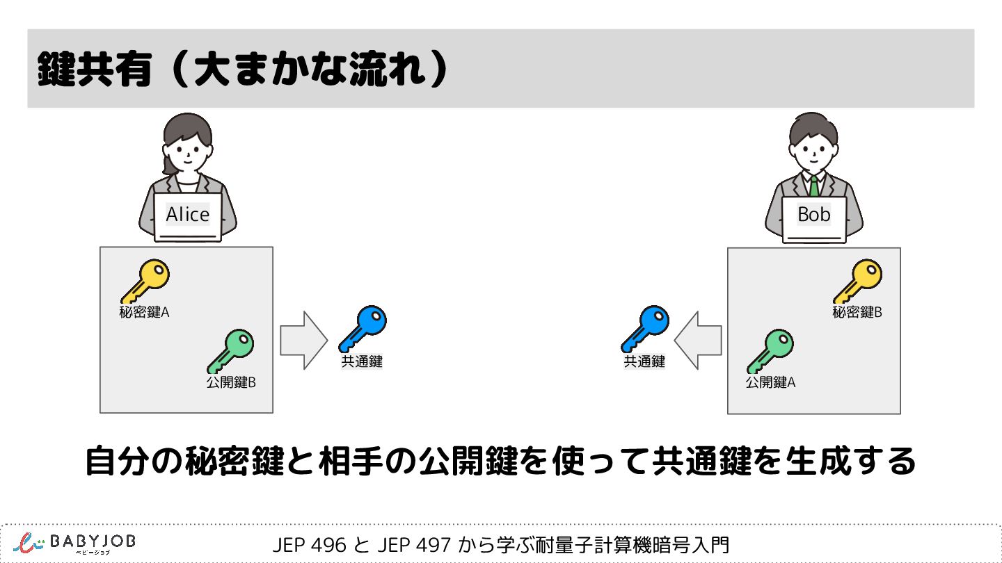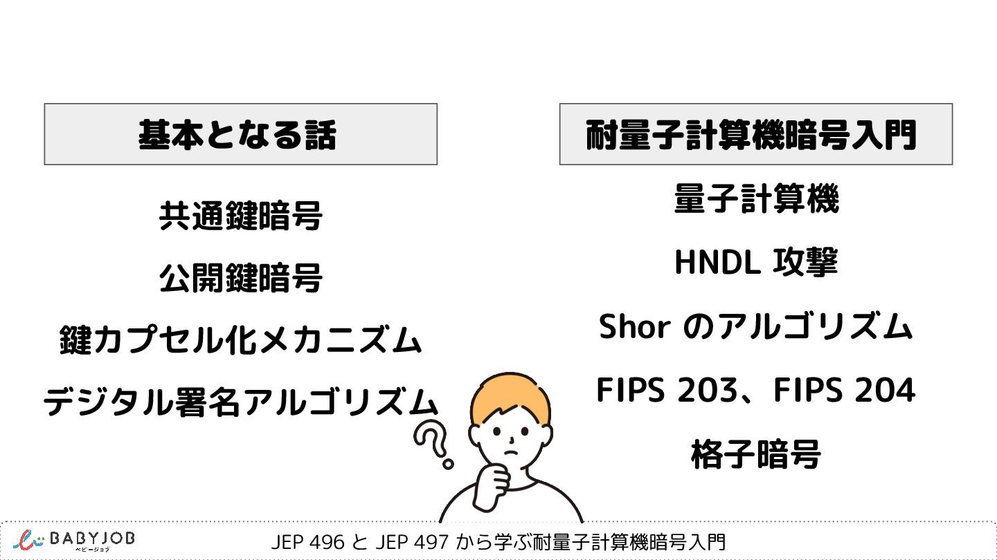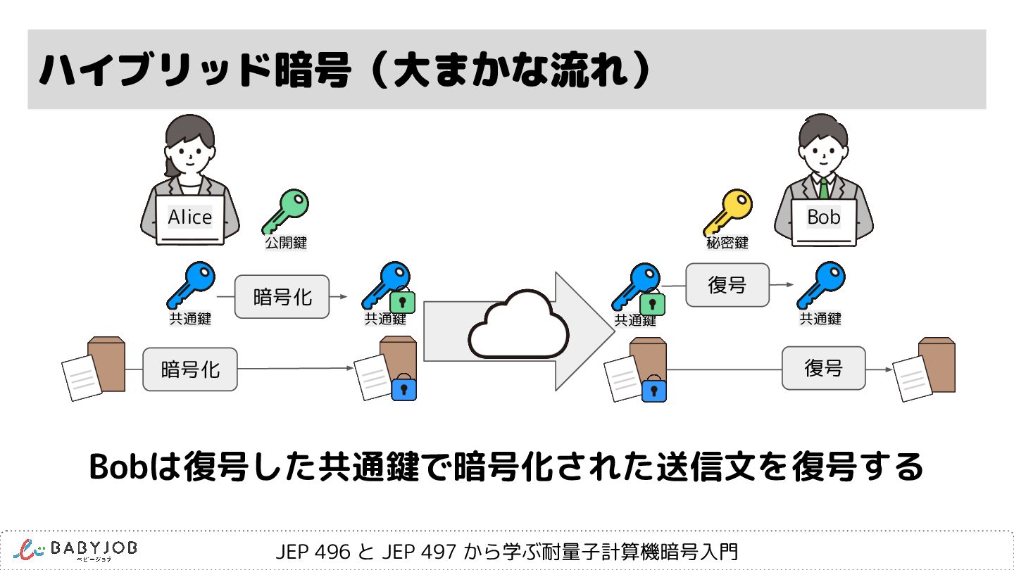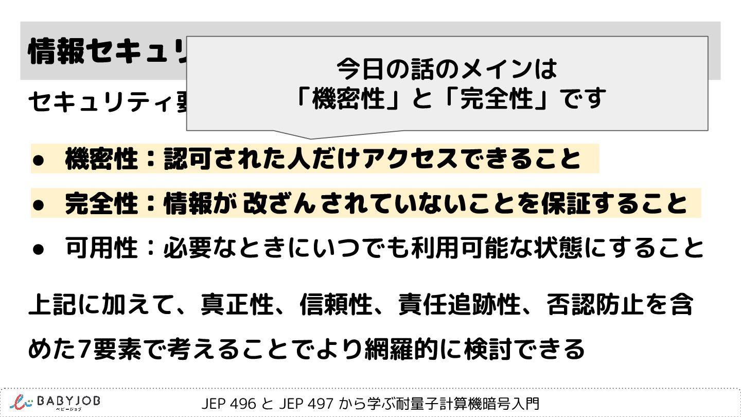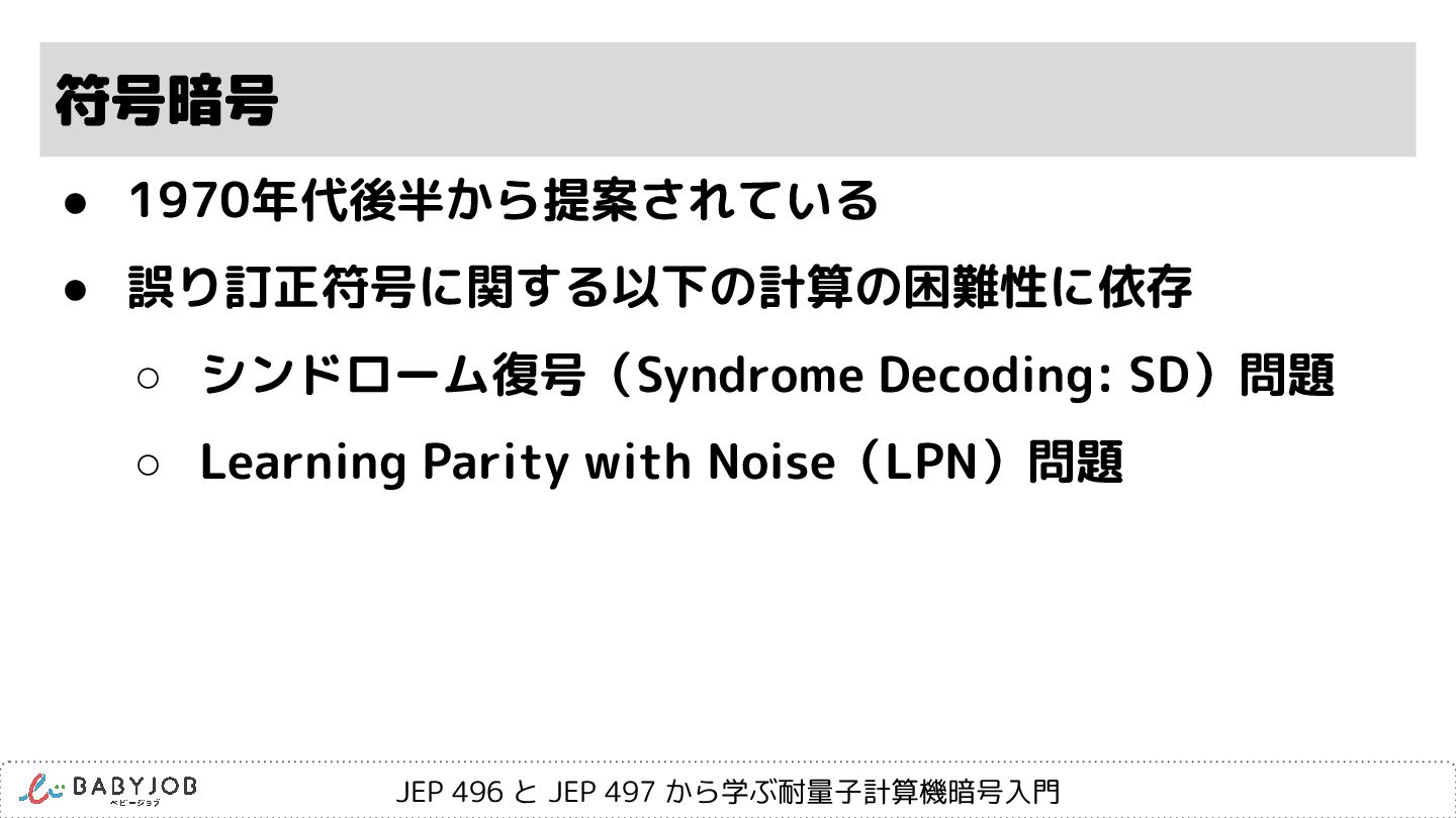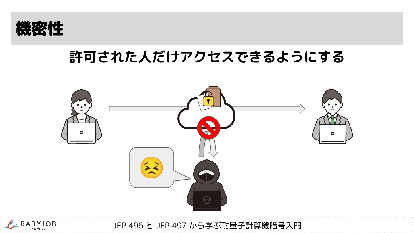 203 ◦ ML-KEM(Module-Lattice-Based Key-Encapsulation Mechanism) ◦ 格子暗号の鍵交換アルゴリズムのCRYSTALS-Kyberがベース • FIPS 204 ◦ ML-DSA(Module-Lattice-Based Digital Signature Algorithm) ◦ 格子暗号の電子署名アルゴリズムのCRYSTALS-Dilithiumがベース • FIPS 205 ◦ SLH-DSA(Stateless Hash-Based Digital Signature Algorithm ◦ ハッシュ関数の電子署名アルゴリズムのSPHINCS+がベース ◦ ML-DSAが脆弱であると判明した場合のバックアップ