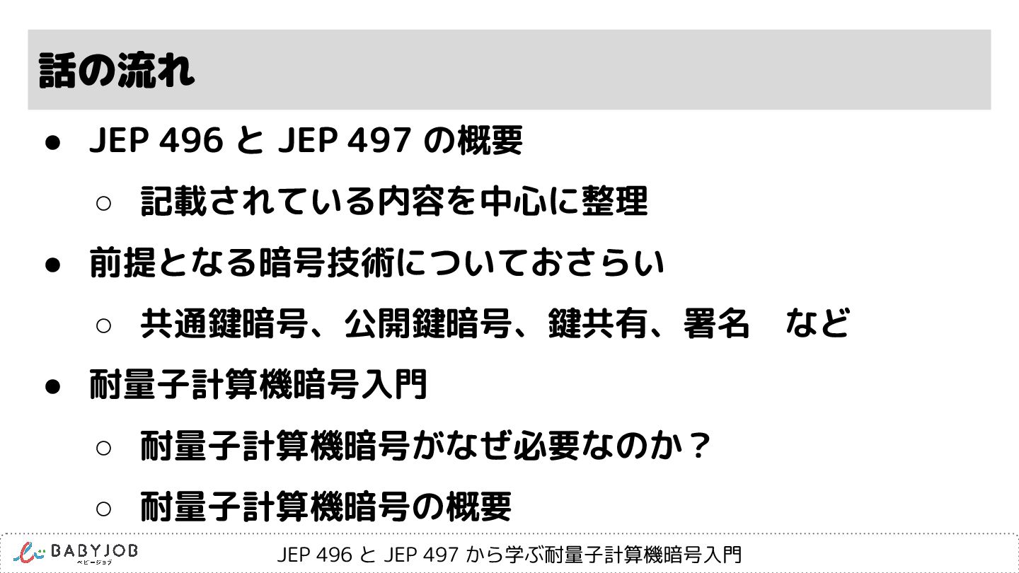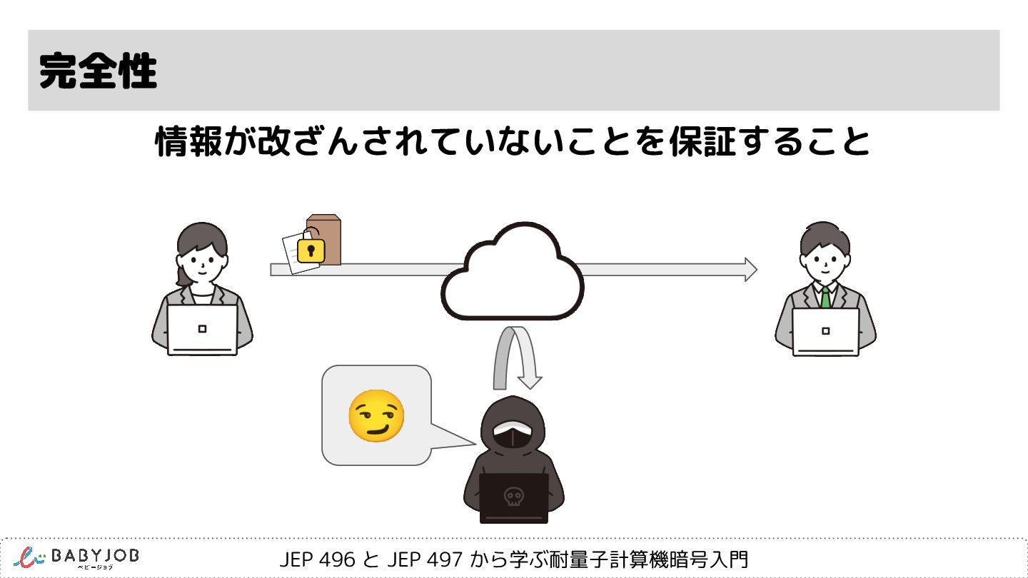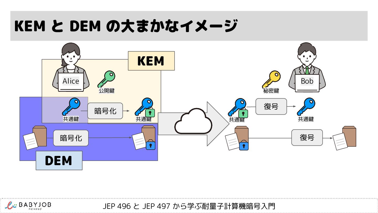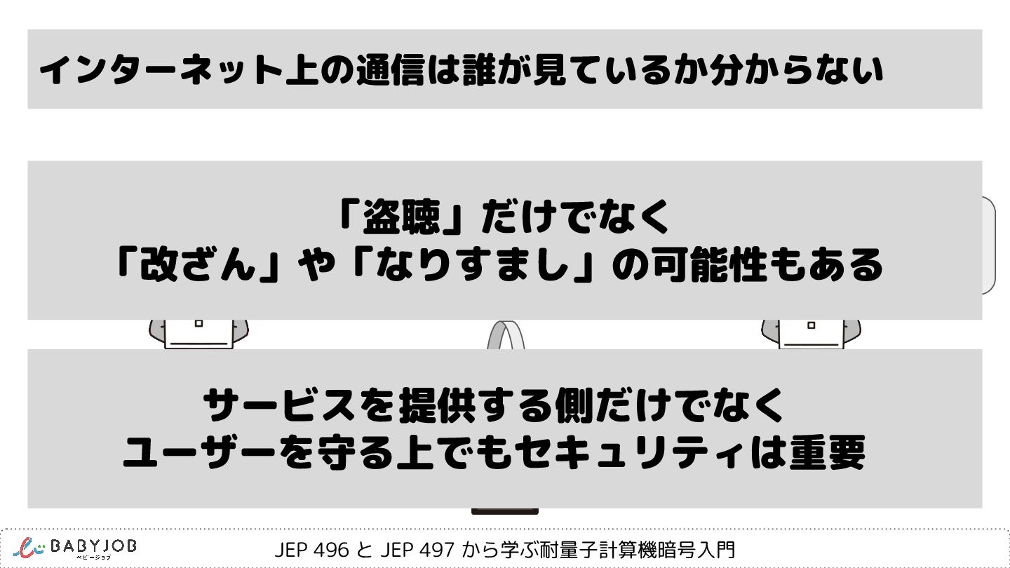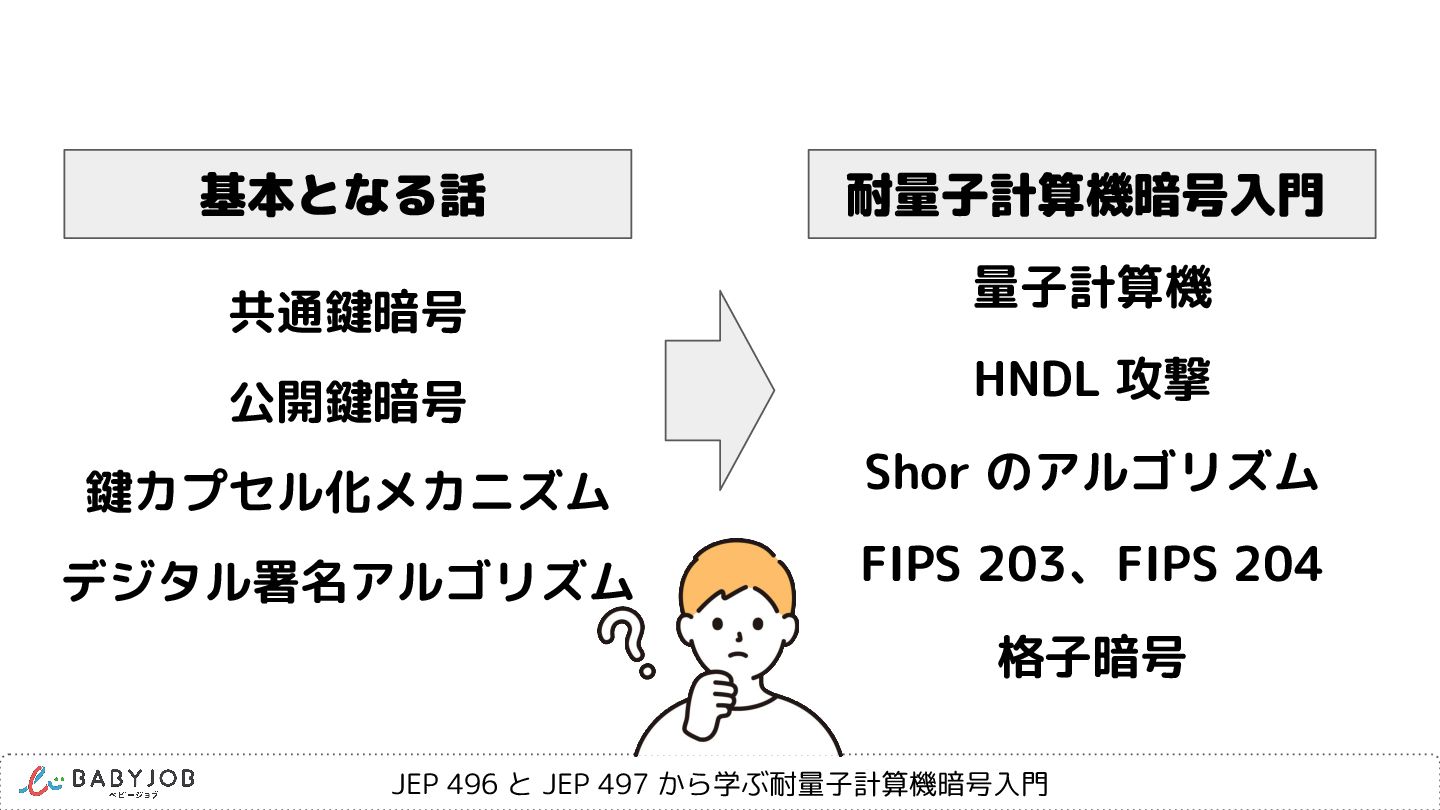 203 ◦ ML-KEM(Module-Lattice-Based Key-Encapsulation Mechanism) ◦ 格子暗号の鍵交換アルゴリズムのCRYSTALS-Kyberがベース • FIPS 204 ◦ ML-DSA(Module-Lattice-Based Digital Signature Algorithm) ◦ 格子暗号の電子署名アルゴリズムのCRYSTALS-Dilithiumがベース • FIPS 205 ◦ SLH-DSA(Stateless Hash-Based Digital Signature Algorithm ◦ ハッシュ関数の電子署名アルゴリズムのSPHINCS+がベース ◦ ML-DSAが脆弱であると判明した場合のバックアップ