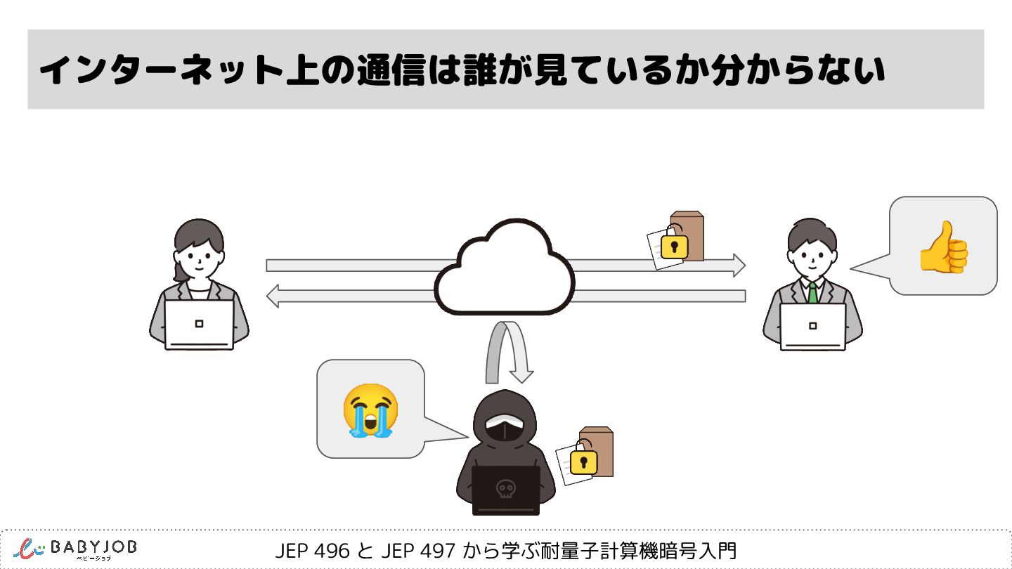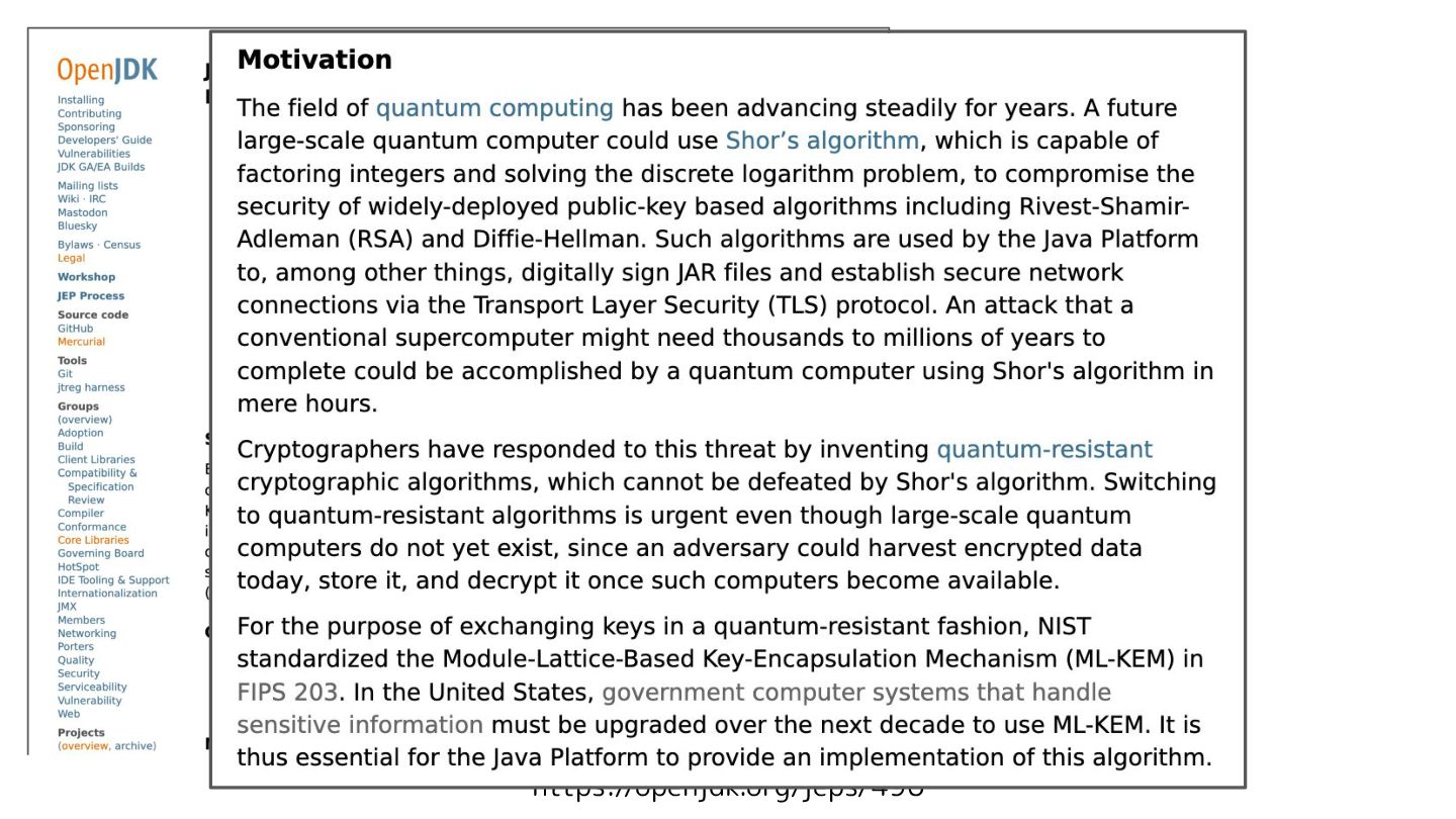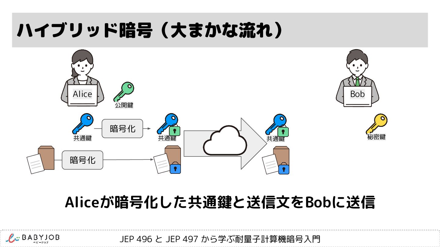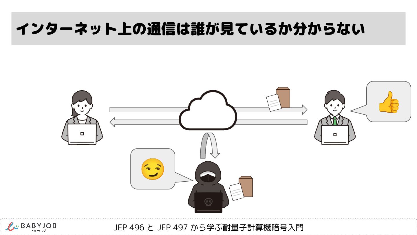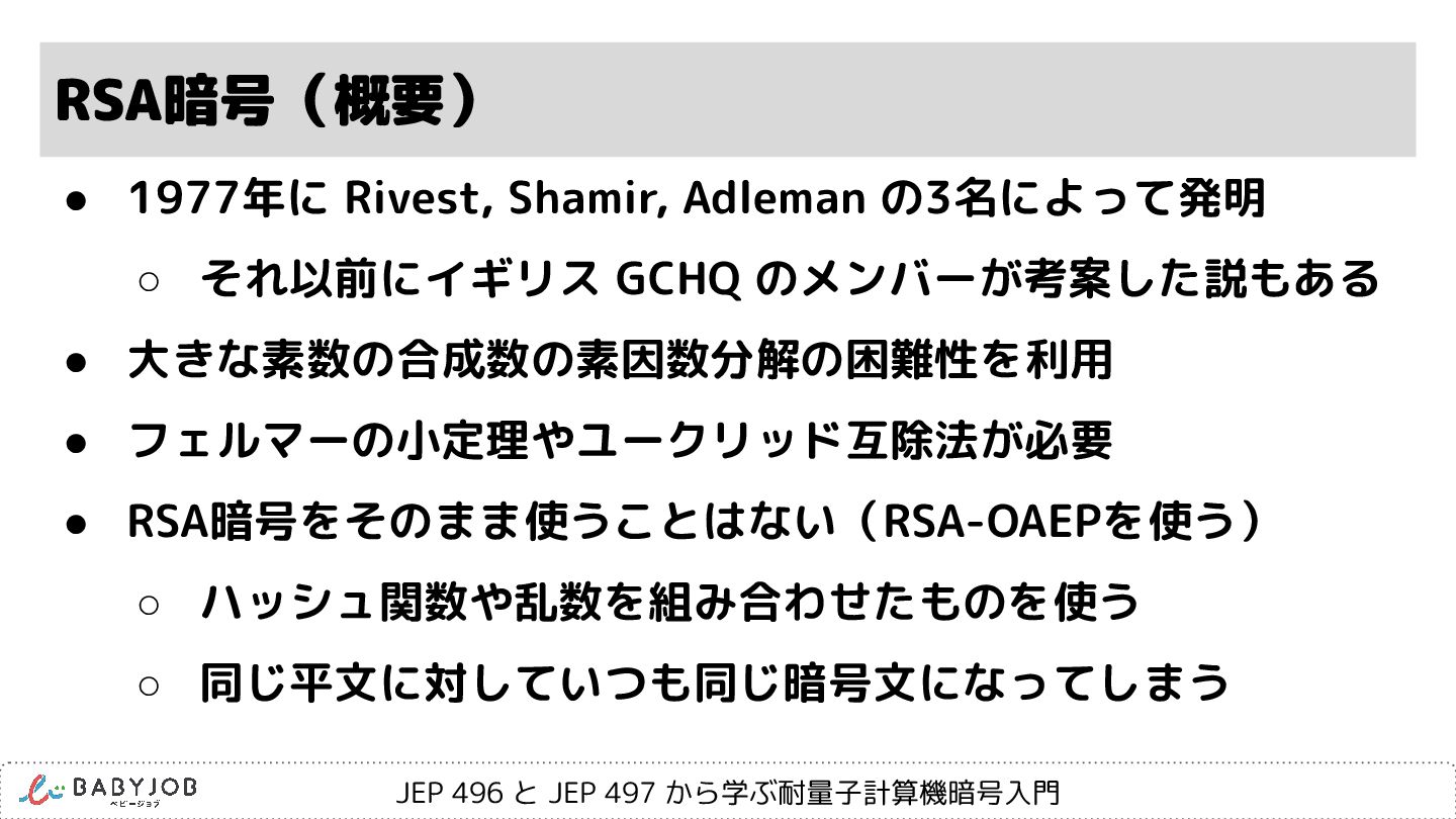 203 ◦ ML-KEM(Module-Lattice-Based Key-Encapsulation Mechanism) ◦ 格子暗号の鍵交換アルゴリズムのCRYSTALS-Kyberがベース • FIPS 204 ◦ ML-DSA(Module-Lattice-Based Digital Signature Algorithm) ◦ 格子暗号の電子署名アルゴリズムのCRYSTALS-Dilithiumがベース • FIPS 205 ◦ SLH-DSA(Stateless Hash-Based Digital Signature Algorithm ◦ ハッシュ関数の電子署名アルゴリズムのSPHINCS+がベース ◦ ML-DSAが脆弱であると判明した場合のバックアップ