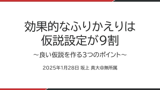 効果的なふりかえりは 仮説設定が9割 〜良い仮説を作る3つのポイント〜 2025年1月28日 坂上 真大@無所属