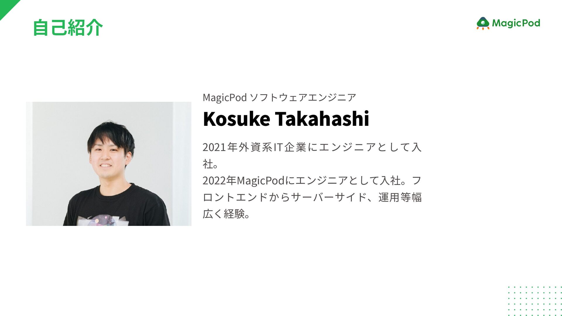 Kosuke Takahashi 2021年外資系IT企業にエンジニアとして入 社。 2022年MagicPodにエンジニアとして入社。フ ロントエンドからサーバーサイド、運用等幅 広く経験。 MagicPod ソフトウェアエンジニア 自己紹介