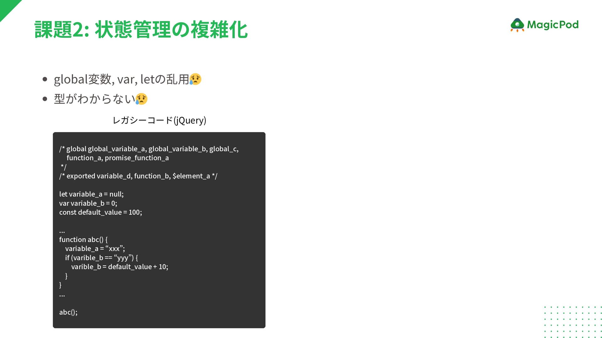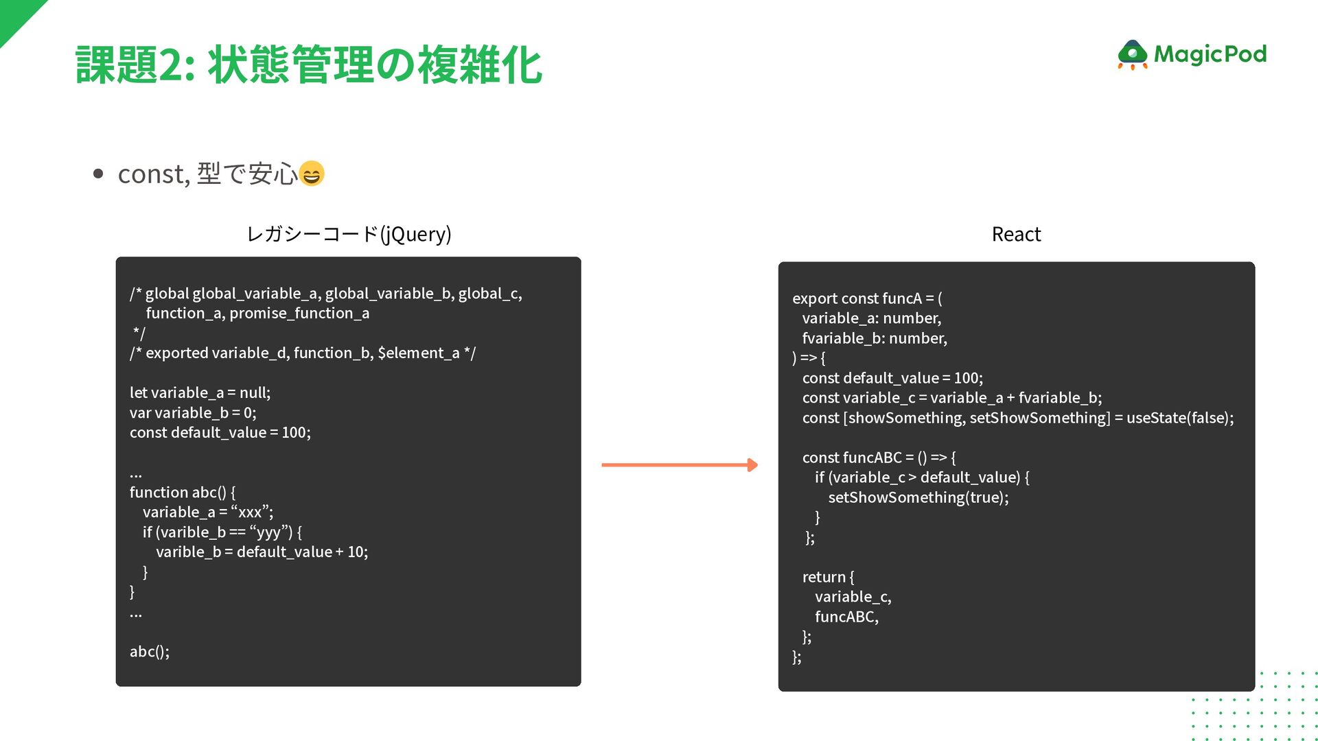 */ /* exported variable_d, function_b, $element_a */ let variable_a = null; var variable_b = 0; const default_value = 100; ... function abc() { variable_a = “xxx”; if (varible_b == “yyy”) { varible_b = default_value + 10; } } ... abc(); 課題2: 状態管理の複雑化 export const funcA = ( variable_a: number, fvariable_b: number, ) => { const default_value = 100; const variable_c = variable_a + fvariable_b; const [showSomething, setShowSomething] = useState(false); const funcABC = () => { if (variable_c > default_value) { setShowSomething(true); } }; return { variable_c, funcABC, }; }; レガシーコード(jQuery) React
