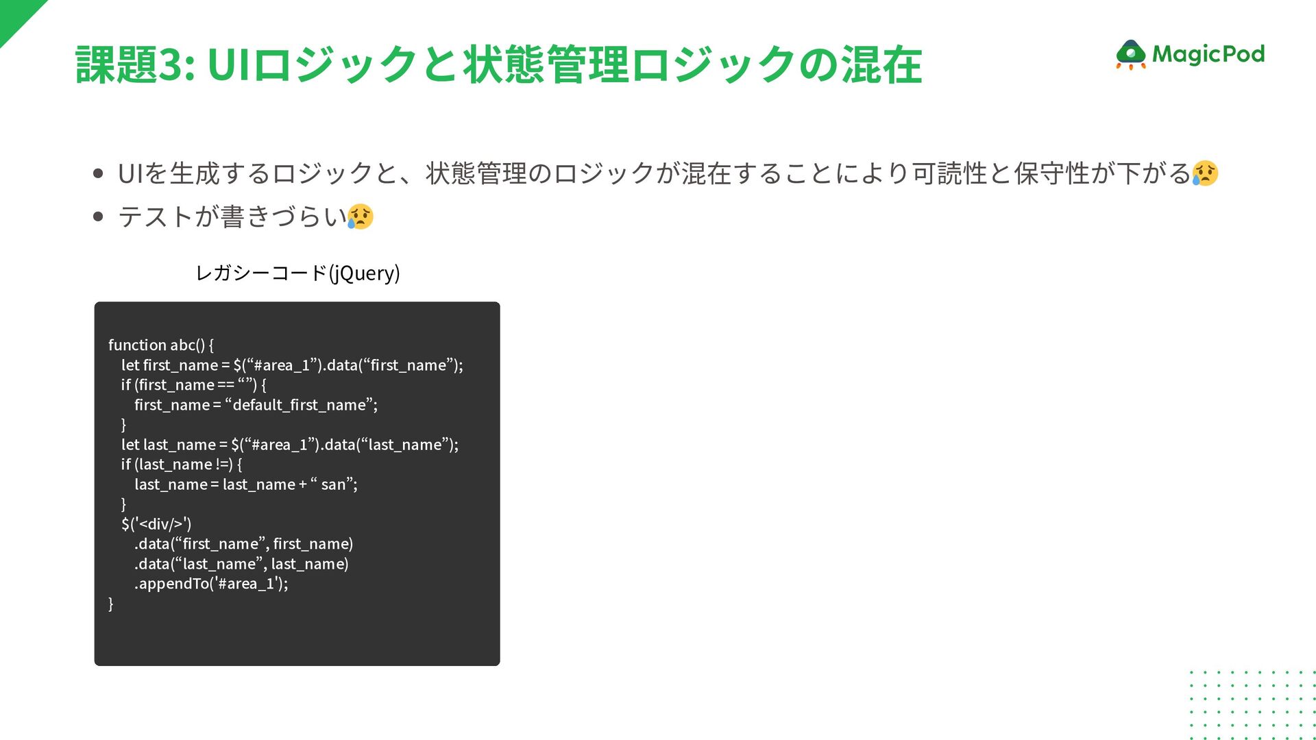 課題3: UIロジックと状態管理ロジックの混在 function abc() { let first_name = $(“#area_1”).data(“first_name”); if