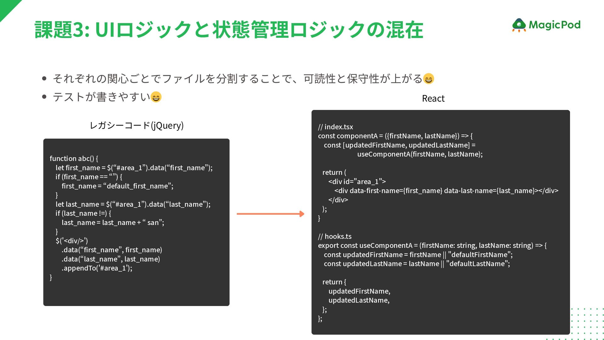 (first_name == “”) { first_name = “default_first_name”; } let last_name = $(“#area_1”).data(“last_name”); if (last_name !=) { last_name = last_name + “ san”; } $('<div/>') .data(“first_name”, first_name) .data(“last_name”, last_name) .appendTo('#area_1'); } それぞれの関心ごとでファイルを分割することで、可読性と保守性が上がる 😄 テストが書きやすい 😄 // index.tsx const componentA = ({firstName, lastName}) => { const [updatedFirstName, updatedLastName] = useComponentA(firstName, lastName); return ( <div id="area_1"> <div data-first-name={first_name} data-last-name={last_name}></div> </div> ); } // hooks.ts export const useComponentA = (firstName: string, lastName: string) => { const updatedFirstName = firstName || "defaultFirstName"; const updatedLastName = lastName || "defaultLastName"; return { updatedFirstName, updatedLastName, }; }; React レガシーコード(jQuery)