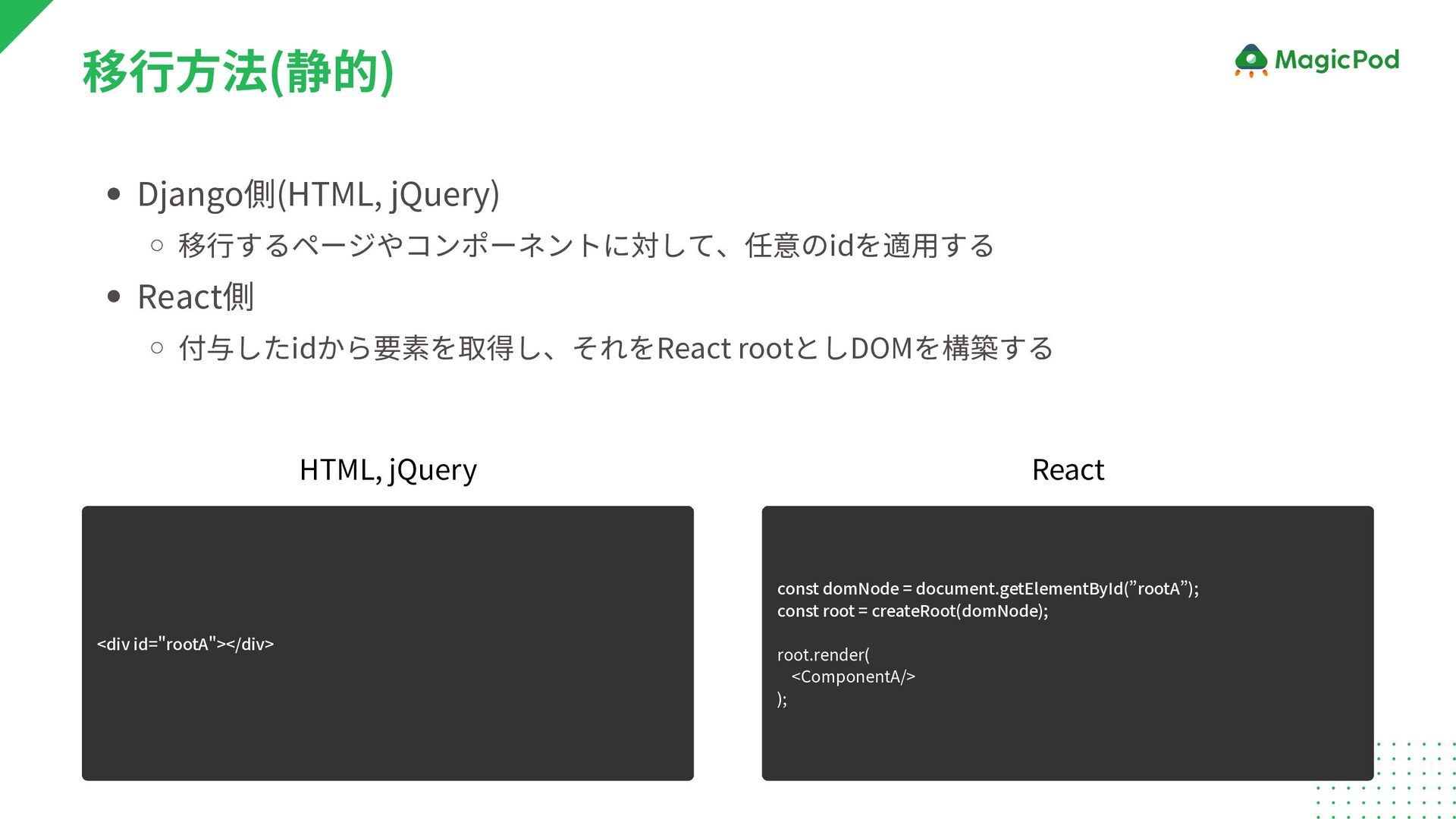 Django側(HTML, jQuery) 移行するページやコンポーネントに対して、任意のidを適用する React側 付与したidから要素を取得し、それをReact rootとしDOMを構築する const domNode = document.getElementById(”rootA”);