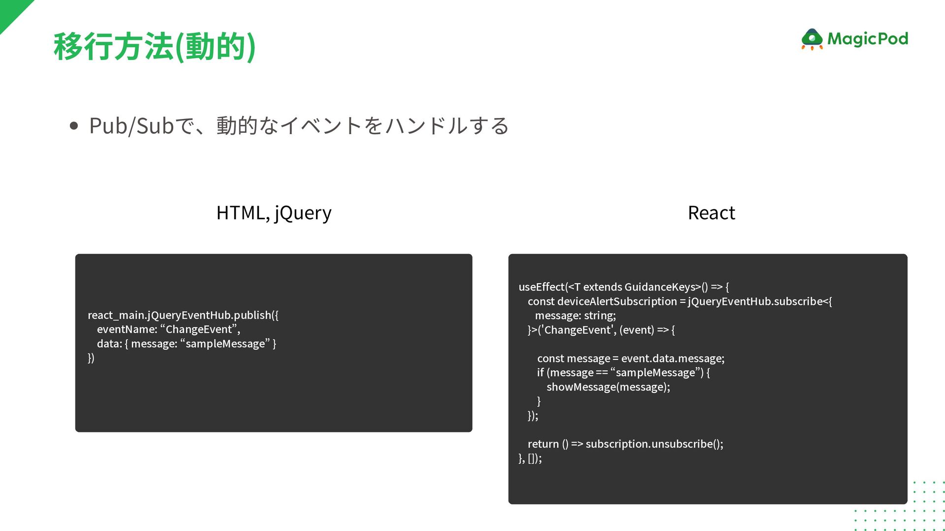移行方法(動的) useEffect(<T extends GuidanceKeys>() => { const deviceAlertSubscription = jQueryEventHub.subscribe<{ message: string; }>('ChangeEvent', (event) => { const message = event.data.message; if (message == “sampleMessage”) { showMessage(message); } }); return () => subscription.unsubscribe(); }, []); HTML, jQuery React