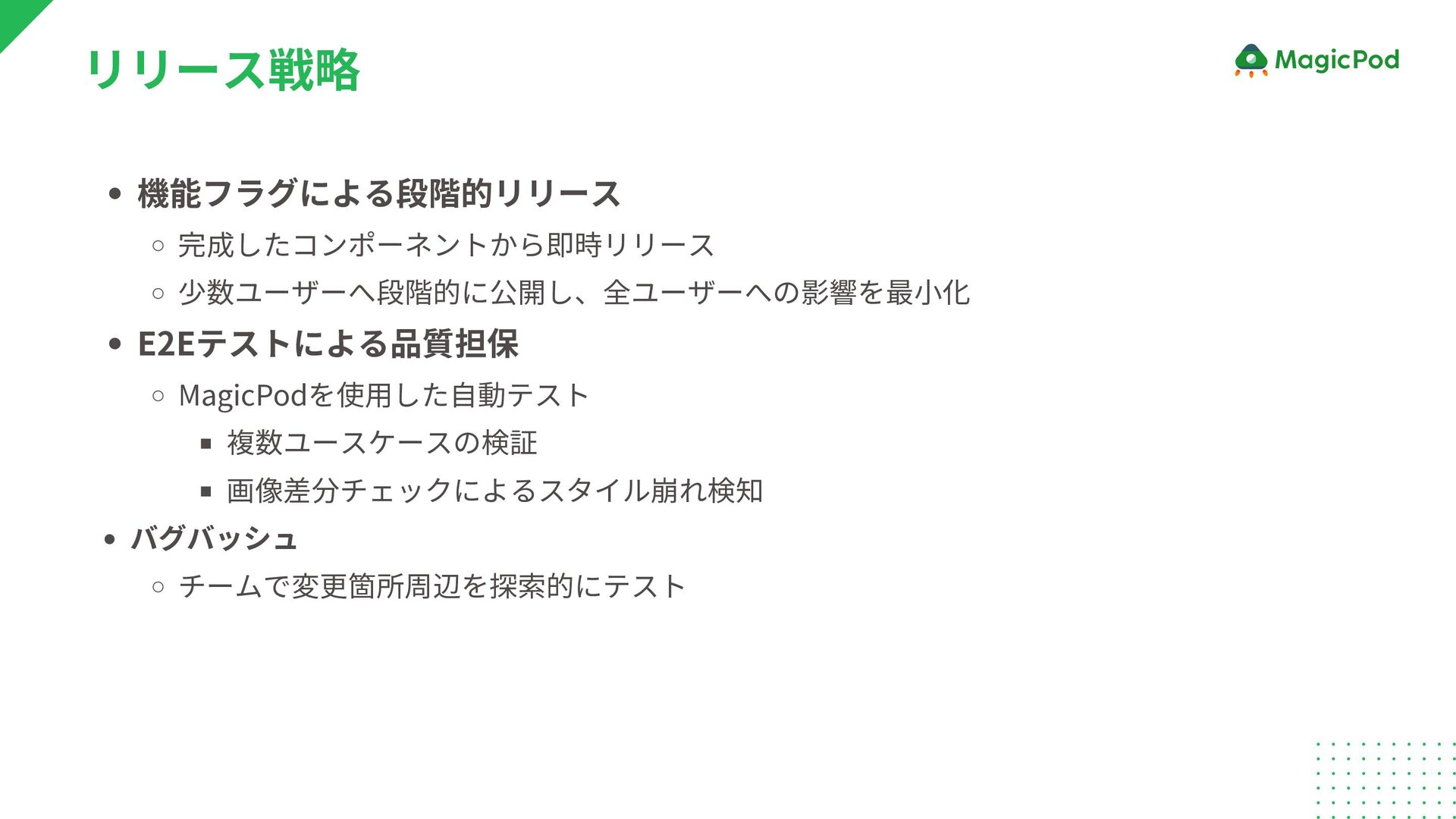 機能フラグによる段階的リリース 完成したコンポーネントから即時リリース 少数ユーザーへ段階的に公開し、全ユーザーへの影響を最小化 E2Eテストによる品質担保 MagicPodを使用した自動テスト 複数ユースケースの検証 画像差分チェックによるスタイル崩れ検知 バグバッシュ チームで変更箇所周辺を探索的にテスト リリース戦略