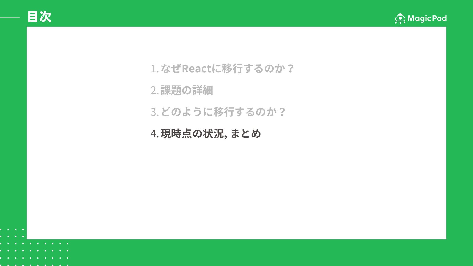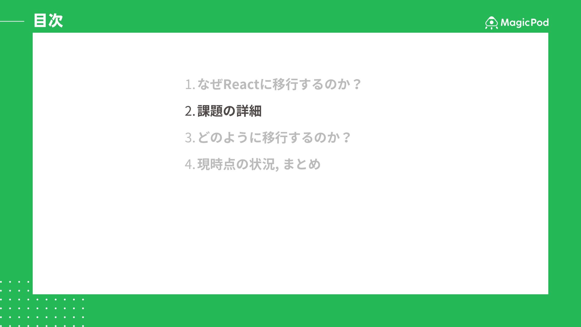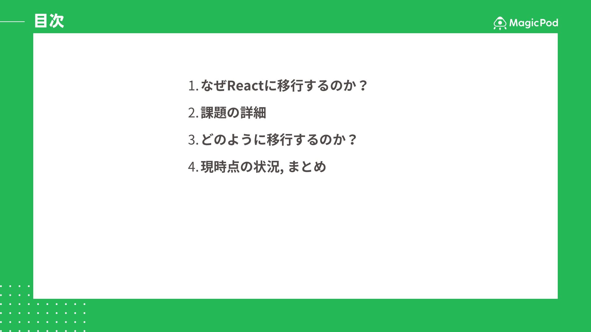 目次 1.なぜReactに移行するのか? 2.課題の詳細 3.どのように移行するのか? 4.現時点の状況, まとめ