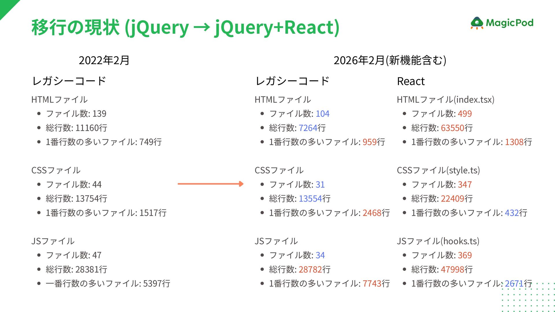 1308行 CSSファイル(style.ts) ファイル数: 347 総行数: 22409行 1番行数の多いファイル: 432行 JSファイル(hooks.ts) ファイル数: 369 総行数: 47998行 1番行数の多いファイル: 2671行 HTMLファイル ファイル数: 139 総行数: 11160行 1番行数の多いファイル: 749行 CSSファイル ファイル数: 44 総行数: 13754行 1番行数の多いファイル: 1517行 JSファイル ファイル数: 47 総行数: 28381行 一番行数の多いファイル: 5397行 HTMLファイル ファイル数: 104 総行数: 7264行 1番行数の多いファイル: 959行 CSSファイル ファイル数: 31 総行数: 13554行 1番行数の多いファイル: 2468行 JSファイル ファイル数: 34 総行数: 28782行 1番行数の多いファイル: 7743行 レガシーコード レガシーコード React 2022年2月 2026年2月(新機能含む)
