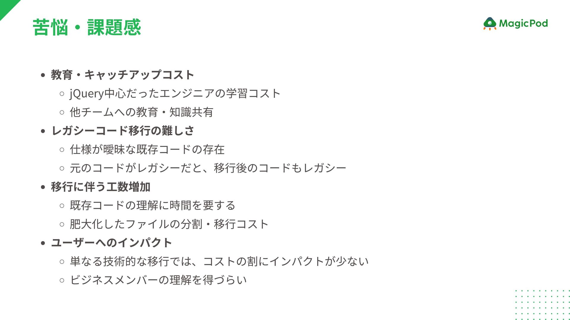 苦悩・課題感 教育・キャッチアップコスト jQuery中心だったエンジニアの学習コスト 他チームへの教育・知識共有 レガシーコード移行の難しさ 仕様が曖昧な既存コードの存在 元のコードがレガシーだと、移行後のコードもレガシー 移行に伴う工数増加 既存コードの理解に時間を要する 肥大化したファイルの分割・移行コスト