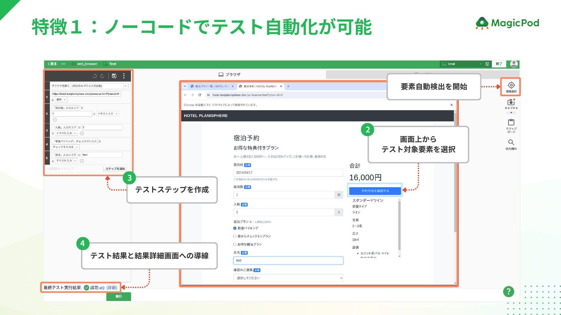 特徴1:ノーコードでテスト自動化が可能 1 テストステップを作成 テスト結果と結果詳細画面への導線 画面上から テスト対象要素を選択 要素自動検出を開始 2 3 4