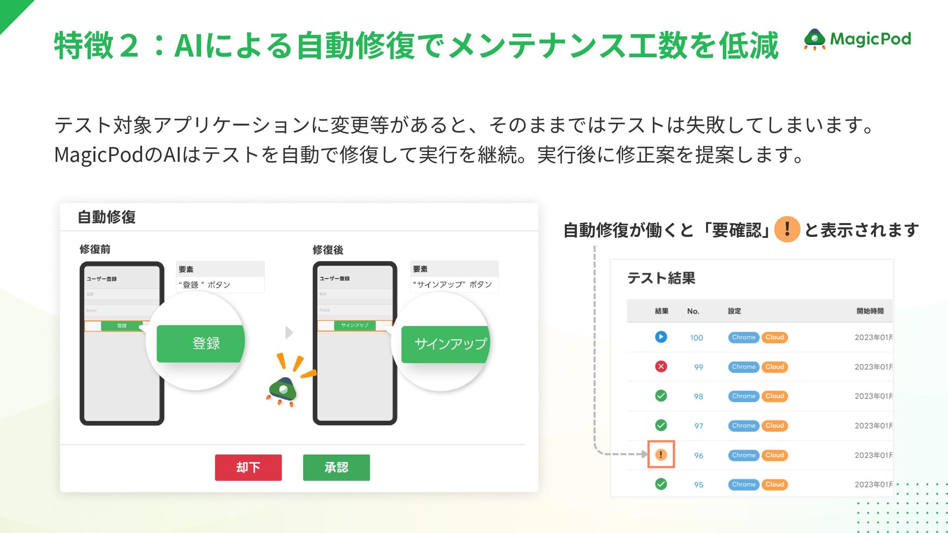 テスト対象アプリケーションに変更等があると、そのままではテストは失敗してしまいます。 MagicPodのAIはテストを自動で修復して実行を継続。実行後に修正案を提案します。 自動修復が働くと「要確認」 と表示されます ! 特徴2:AIによる自動修復でメンテナンス工数を低減