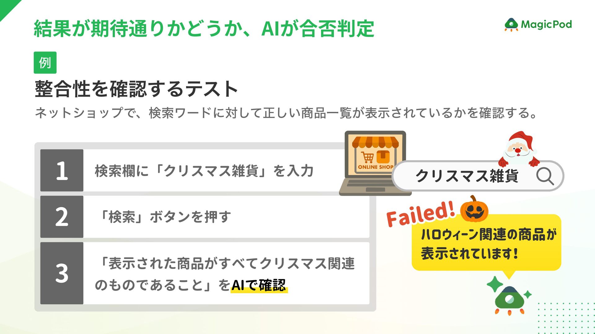 結果が期待通りかどうか、AIが合否判定 「表示された商品がすべてクリスマス関連 のものであること」をAIで確認 ハロウィーン関連の商品が 表示されています! 整合性を確認するテスト ネットショップで、検索ワードに対して正しい商品一覧が表示されているかを確認する。 例 1 2
