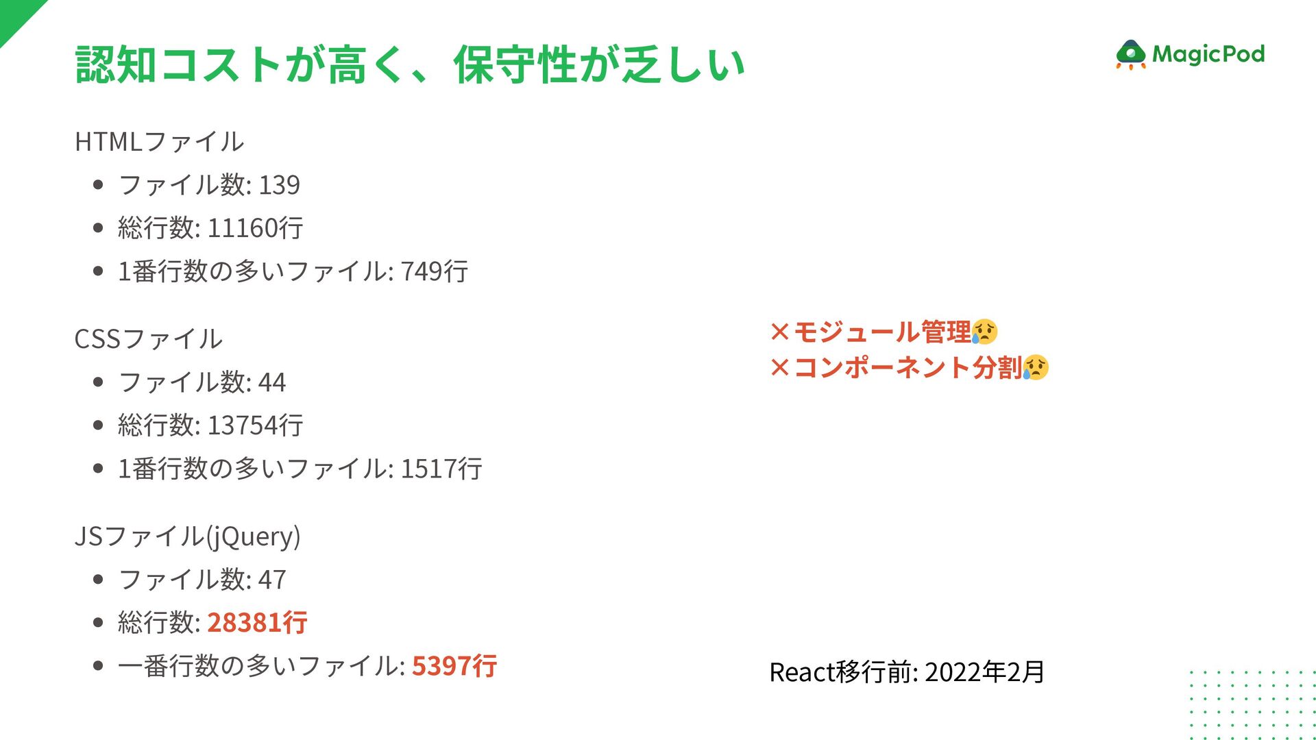 44 総行数: 13754行 1番行数の多いファイル: 1517行 JSファイル(jQuery) ファイル数: 47 総行数: 28381行 一番行数の多いファイル: 5397行 React移行前: 2022年2月 ×モジュール管理 😥 ×コンポーネント分割 😥