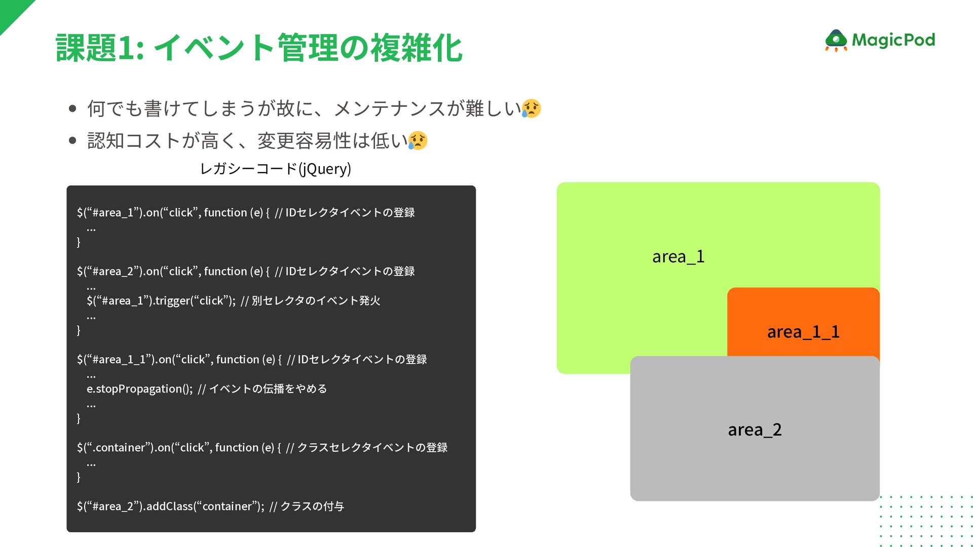 (e) { // IDセレクタイベントの登録 ... $(“#area_1”).trigger(“click”); // 別セレクタのイベント発火 ... } $(“#area_1_1”).on(“click”, function (e) { // IDセレクタイベントの登録 ... e.stopPropagation(); // イベントの伝播をやめる ... } $(“.container”).on(“click”, function (e) { // クラスセレクタイベントの登録 ... } $(“#area_2”).addClass(“container”); // クラスの付与 課題1: イベント管理の複雑化 どのHTML要素に、どのイベントが紐づいているかわかりやすい 😄 const AreaButtons = { funcA, funcB, funcC, }: prpps) => { return ( <button id=”area_1" onclick=funcA /> <button id=”area_2" onclick=funcB /> <button id=”area_1_1" onclick=funcC /> ) } レガシーコード(jQuery) React