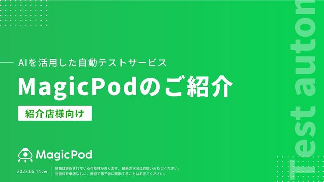 MagicPodのご紹介 AIを活用した自動テストサービス 紹介店様向け Test auto 2023.06.14ver 情報は更新されている可能性があります。最新の状況はお問い合わせください。 当資料を承諾なしに、無断で第三者に開示することはお控えください。