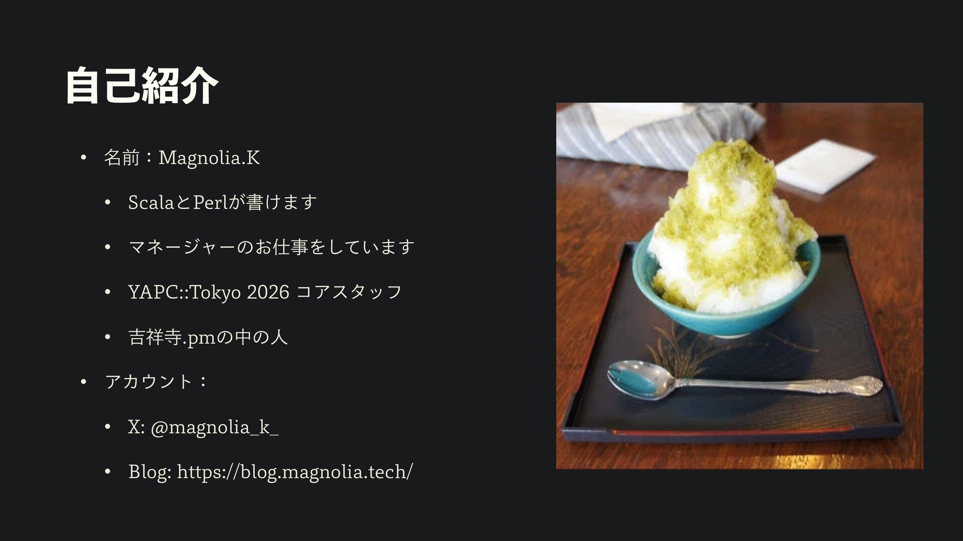 ࣗݾհ w ໊લɿ.BHOPMJB, w 4DBMBͱ1FSM͕ॻ͚·͢ w Ϛωʔδϟʔͷ͓ࣄΛ͍ͯ͠·͢ w :"1$5PLZPίΞελοϑ w