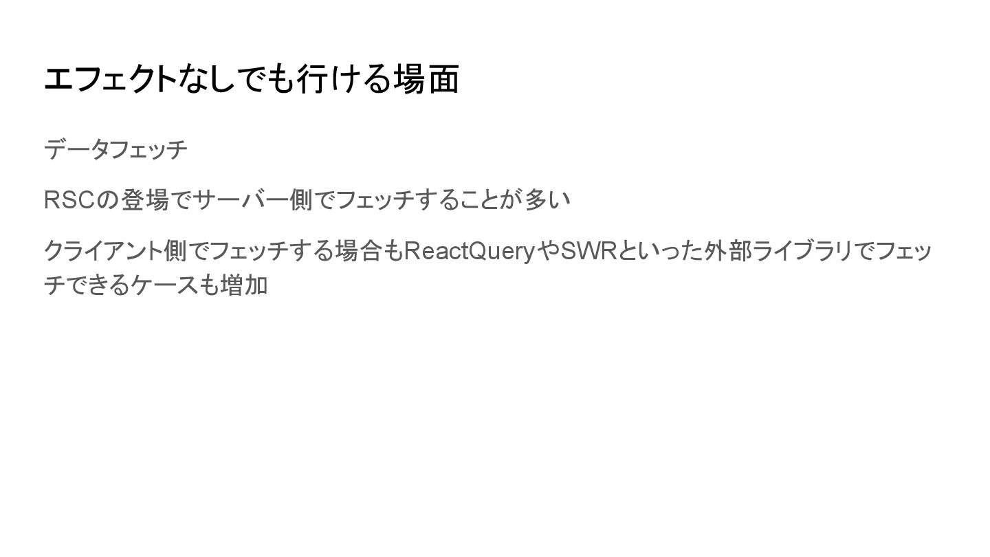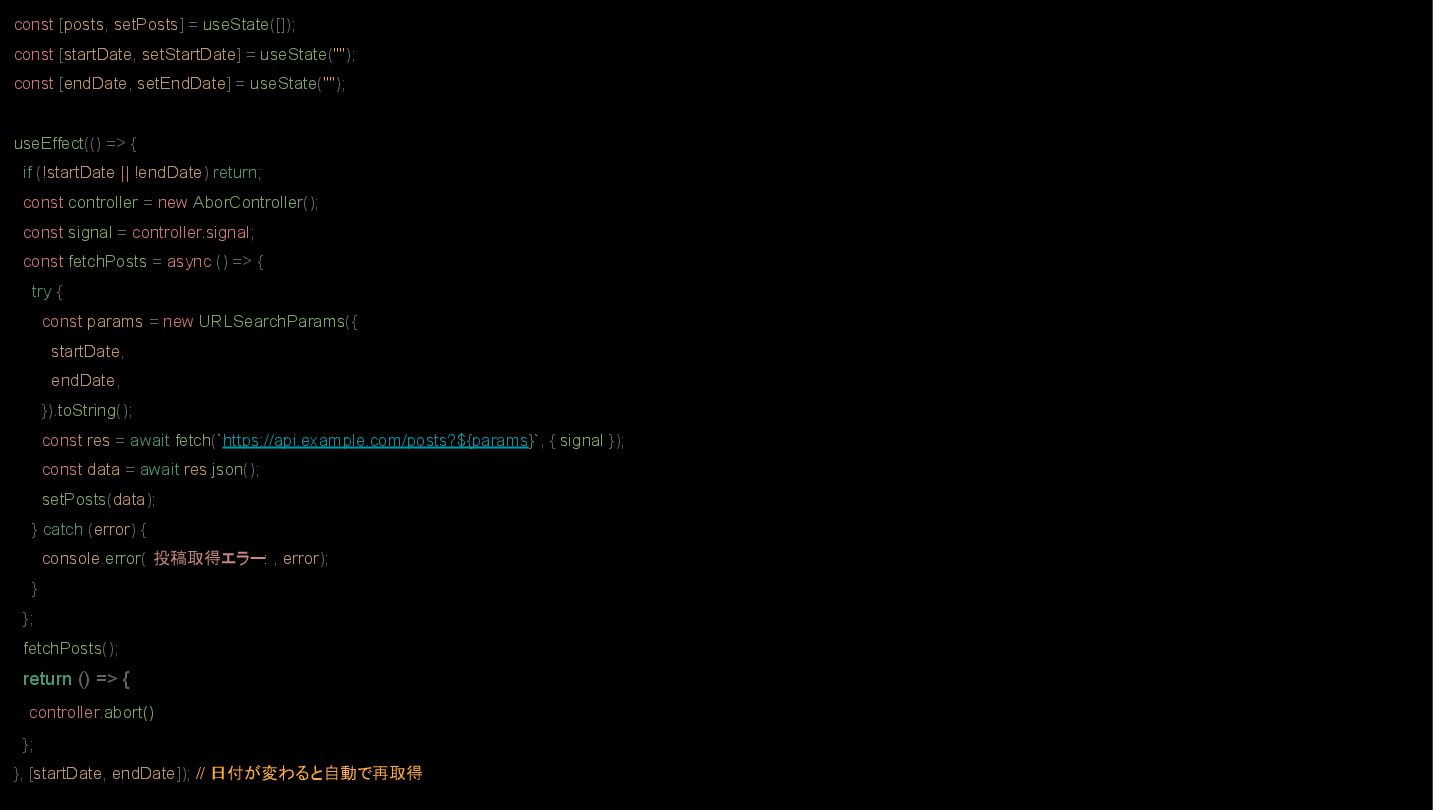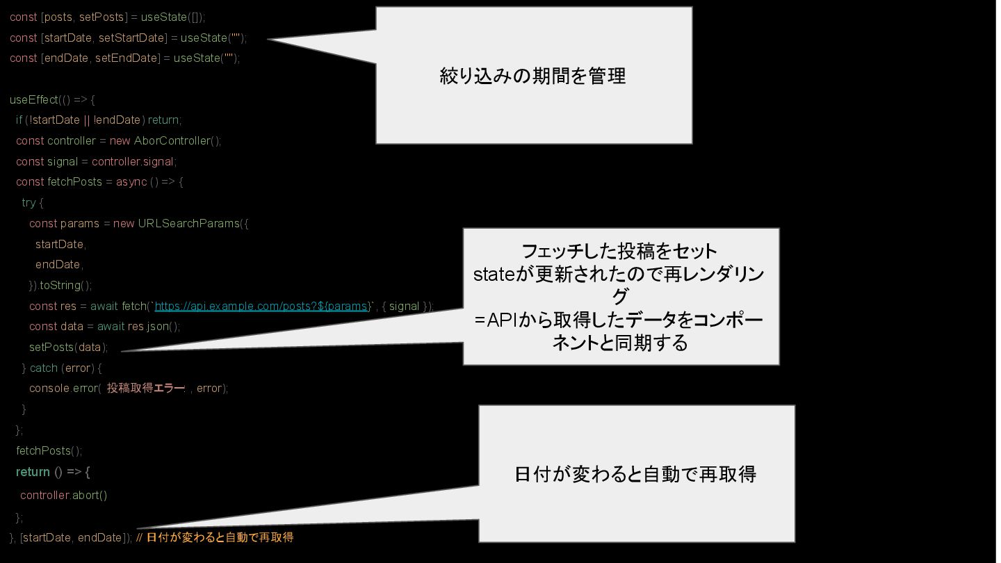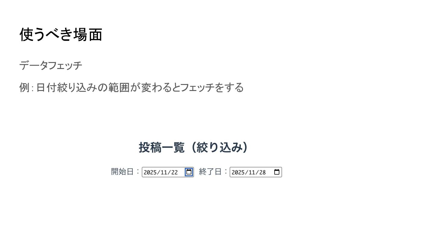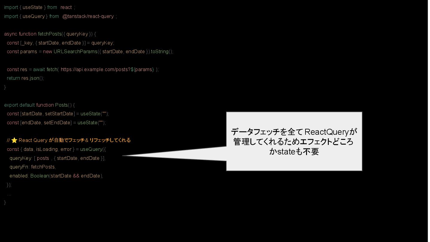 from "@tanstack/react-query"; async function fetchPosts({ queryKey }) { const [_key, { startDate, endDate }] = queryKey; const params = new URLSearchParams({ startDate, endDate }).toString(); const res = await fetch(`https://api.example.com/posts?${params}`); return res.json(); } export default function Posts() { const [startDate, setStartDate] = useState(""); const [endDate, setEndDate] = useState(""); // ⭐ React Query が自動でフェッチ & リフェッチしてくれる const { data, isLoading, error } = useQuery({ queryKey: ["posts", { startDate, endDate }], queryFn: fetchPosts, enabled: Boolean(startDate && endDate), // 両方入力されたときだけ実行 }); ... } データフェッチを全て ReactQueryが 管理してくれるためエフェクトどころ かstateも不要