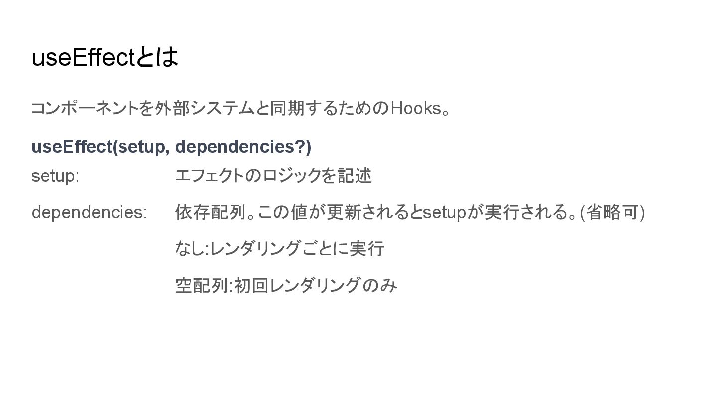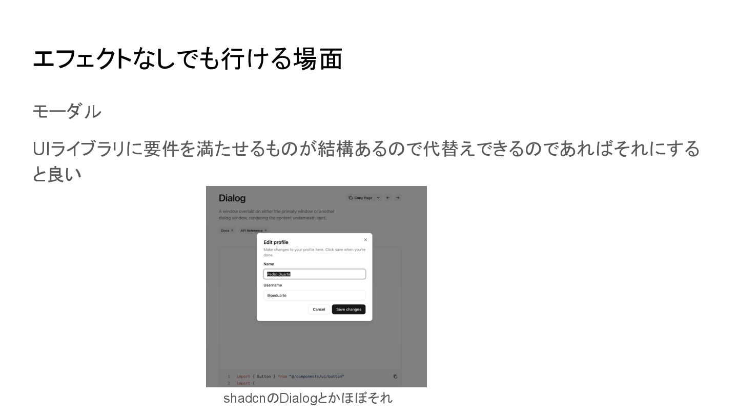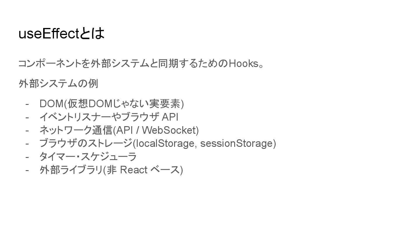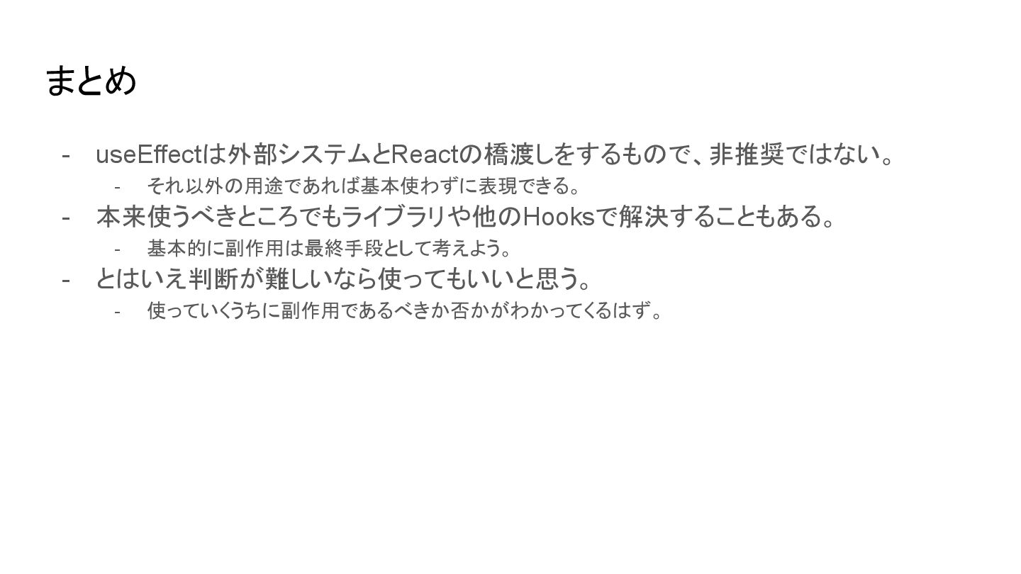 from "@tanstack/react-query"; async function fetchPosts({ queryKey }) { const [_key, { startDate, endDate }] = queryKey; const params = new URLSearchParams({ startDate, endDate }).toString(); const res = await fetch(`https://api.example.com/posts?${params}`); return res.json(); } export default function Posts() { const [startDate, setStartDate] = useState(""); const [endDate, setEndDate] = useState(""); // ⭐ React Query が自動でフェッチ & リフェッチしてくれる const { data, isLoading, error } = useQuery({ queryKey: ["posts", { startDate, endDate }], queryFn: fetchPosts, enabled: Boolean(startDate && endDate), // 両方入力されたときだけ実行 }); ... } データフェッチを全て ReactQueryが 管理してくれるためエフェクトどころ かstateも不要