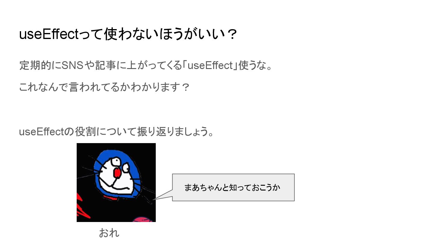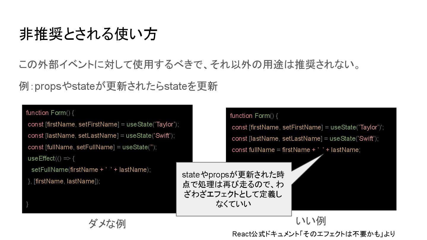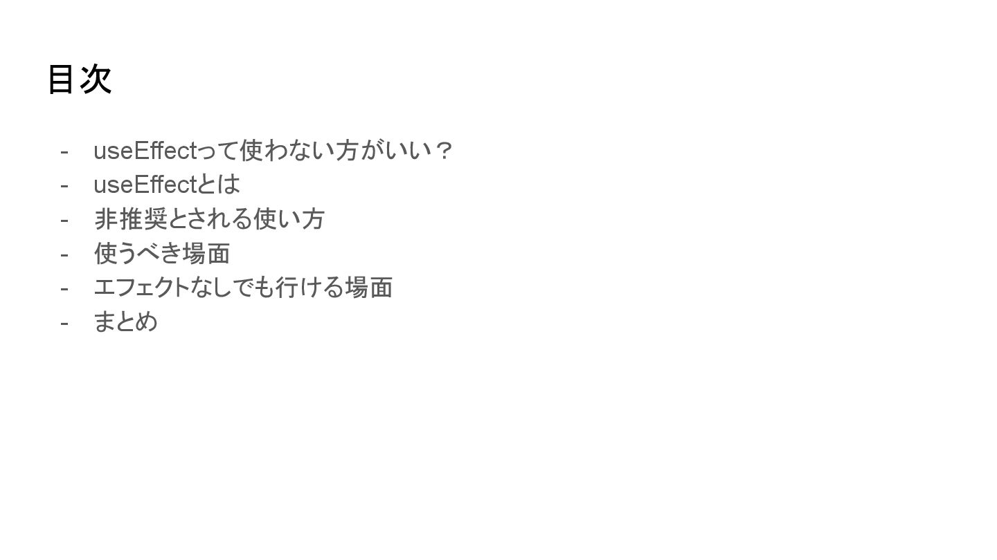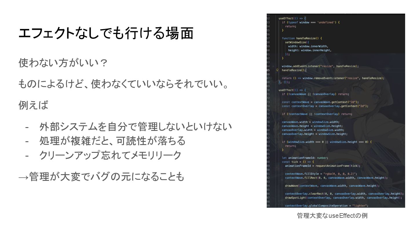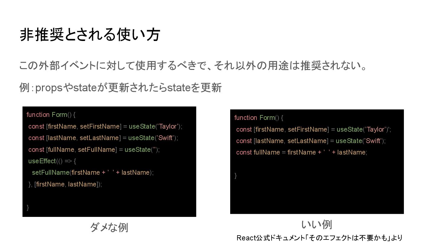 from "@tanstack/react-query"; async function fetchPosts({ queryKey }) { const [_key, { startDate, endDate }] = queryKey; const params = new URLSearchParams({ startDate, endDate }).toString(); const res = await fetch(`https://api.example.com/posts?${params}`); return res.json(); } export default function Posts() { const [startDate, setStartDate] = useState(""); const [endDate, setEndDate] = useState(""); // ⭐ React Query が自動でフェッチ & リフェッチしてくれる const { data, isLoading, error } = useQuery({ queryKey: ["posts", { startDate, endDate }], queryFn: fetchPosts, enabled: Boolean(startDate && endDate), // 両方入力されたときだけ実行 }); ... } データフェッチを全て ReactQueryが 管理してくれるためエフェクトどころ かstateも不要