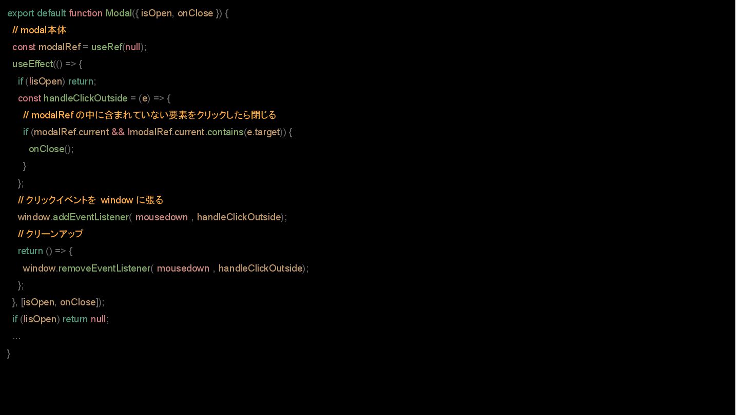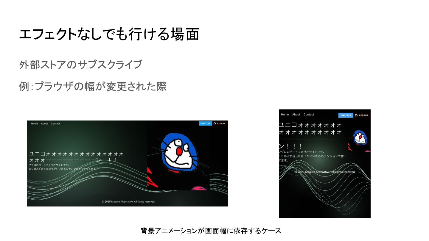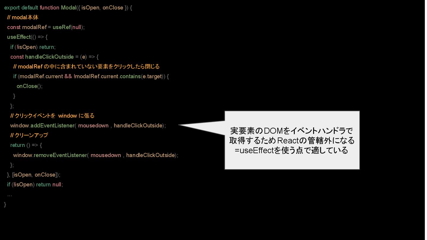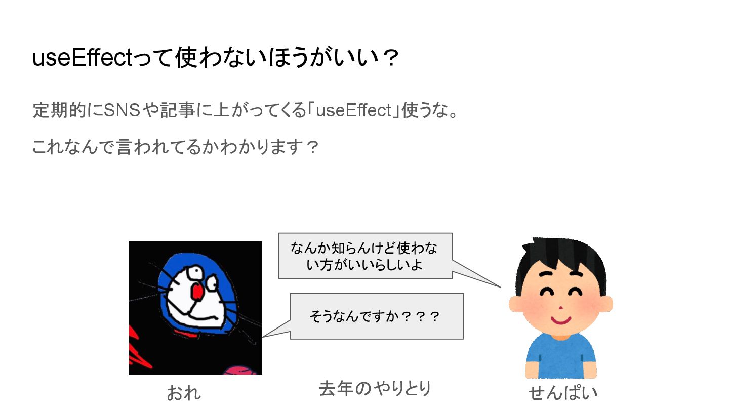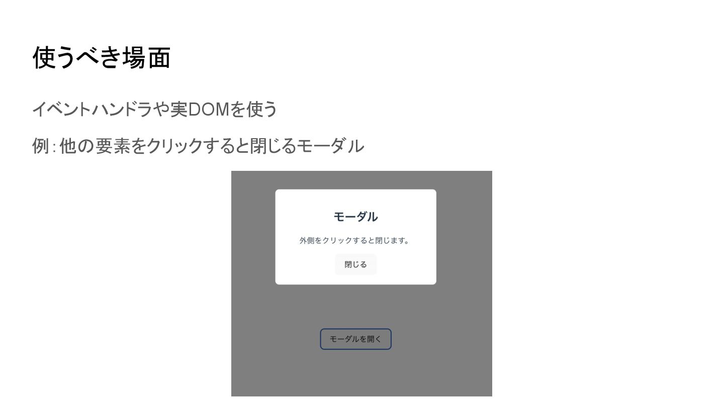 from "@tanstack/react-query"; async function fetchPosts({ queryKey }) { const [_key, { startDate, endDate }] = queryKey; const params = new URLSearchParams({ startDate, endDate }).toString(); const res = await fetch(`https://api.example.com/posts?${params}`); return res.json(); } export default function Posts() { const [startDate, setStartDate] = useState(""); const [endDate, setEndDate] = useState(""); // ⭐ React Query が自動でフェッチ & リフェッチしてくれる const { data, isLoading, error } = useQuery({ queryKey: ["posts", { startDate, endDate }], queryFn: fetchPosts, enabled: Boolean(startDate && endDate), // 両方入力されたときだけ実行 }); ... } データフェッチを全て ReactQueryが 管理してくれるためエフェクトどころ かstateも不要