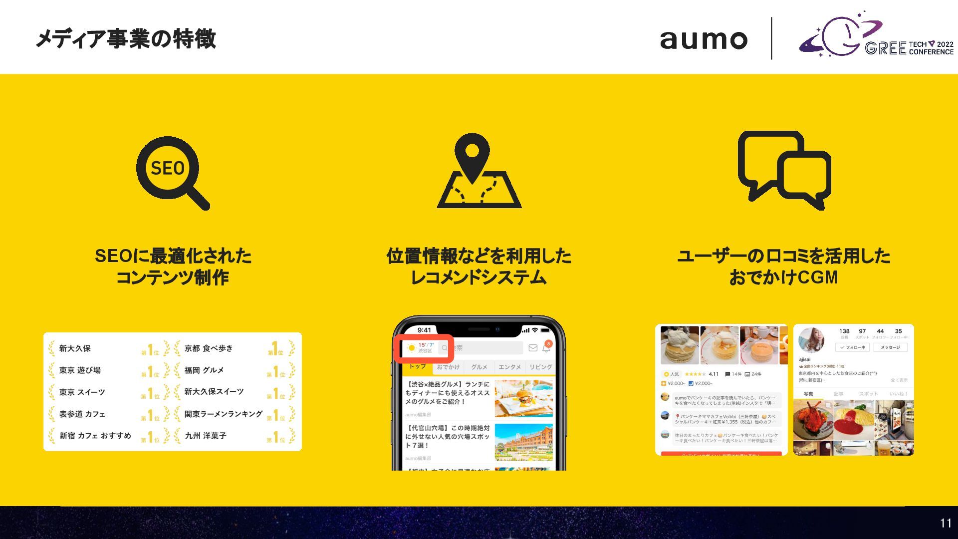 11 11 メディア事業の特徴 SEOに最適化された コンテンツ制作 位置情報などを利用した レコメンドシステム ユーザーの口コミを活用した おでかけCGM