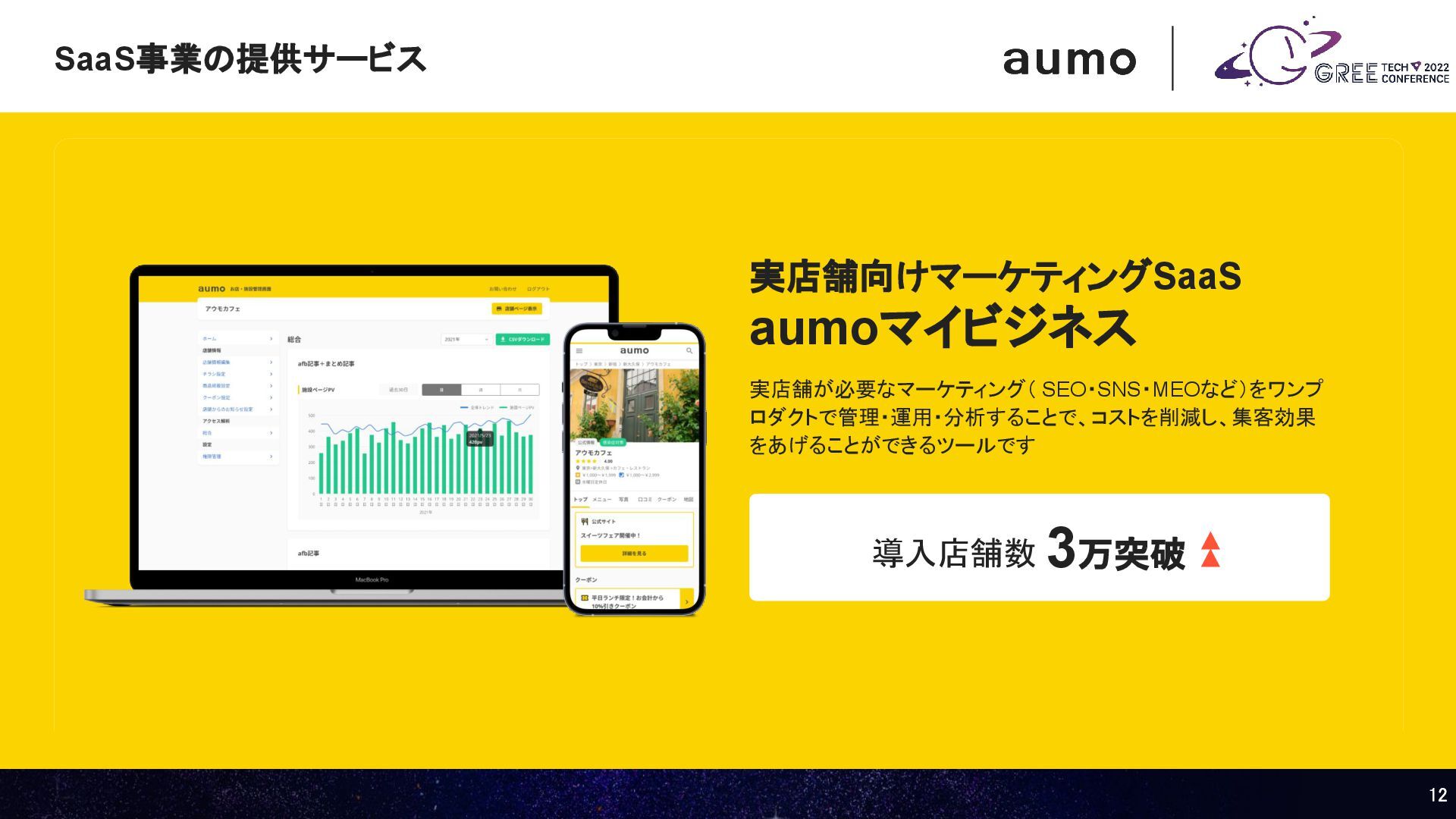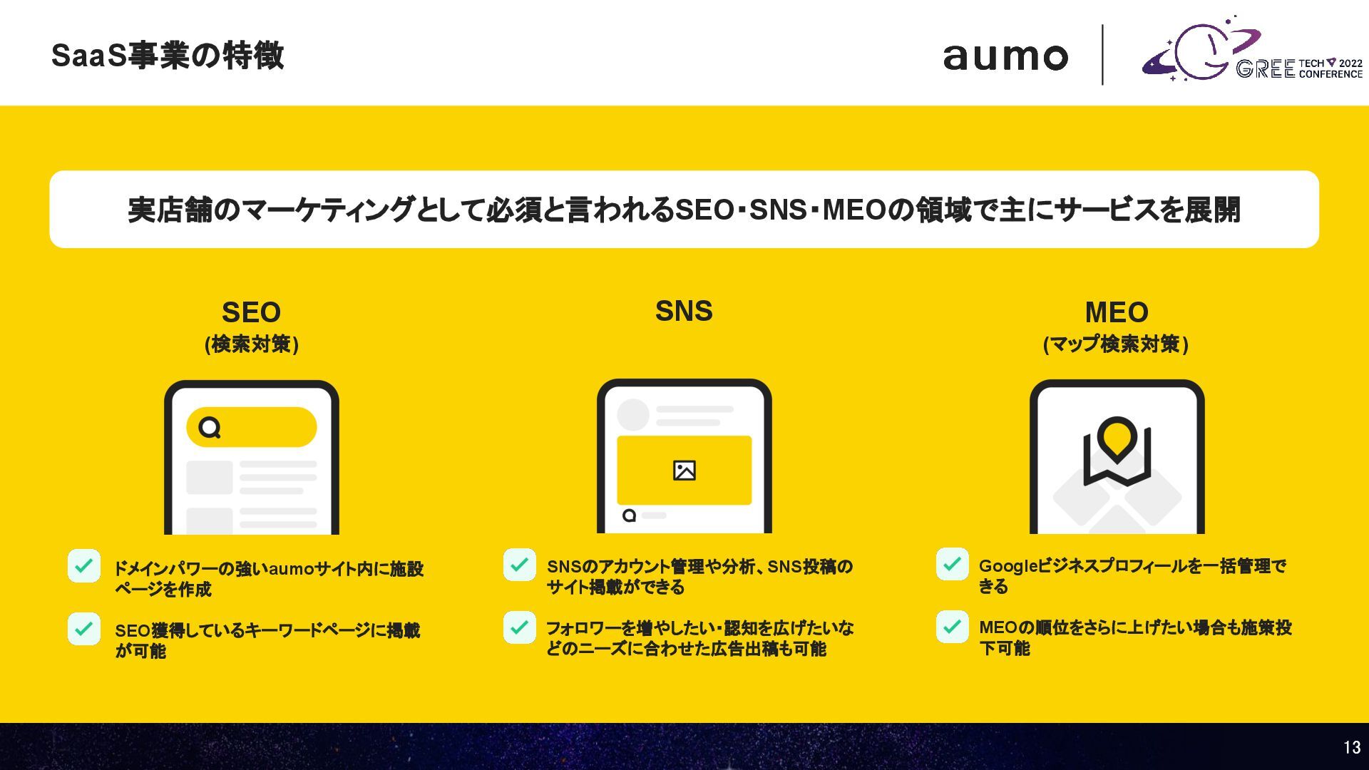 12 12 SaaS事業の提供サービス 実店舗が必要なマーケティング( SEO・SNS・MEOなど)をワンプ ロダクトで管理・運用・分析することで、コストを削減し、集客効果 をあげることができるツールです 実店舗向けマーケティングSaaS aumoマイビジネス 3万突破