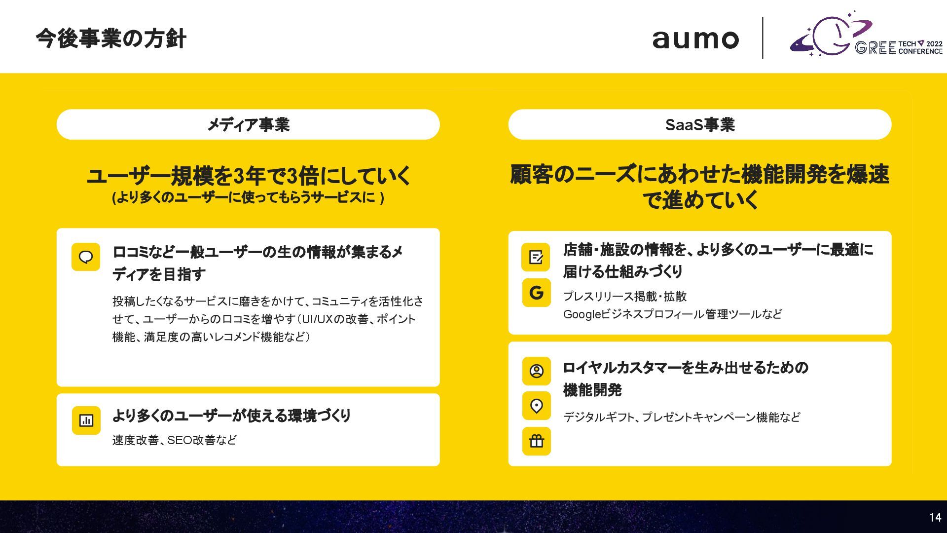 せて、ユーザーからの口コミを増やす(UI/UXの改善、ポイント 機能、満足度の高いレコメンド機能など) より多くのユーザーが使える環境づくり 速度改善、SEO改善など 顧客のニーズにあわせた機能開発を爆速 で進めていく SaaS事業 ロイヤルカスタマーを生み出せるための 機能開発 デジタルギフト、プレゼントキャンペーン機能など 店舗・施設の情報を、より多くのユーザーに最適に 届ける仕組みづくり プレスリリース掲載・拡散 Googleビジネスプロフィール管理ツールなど