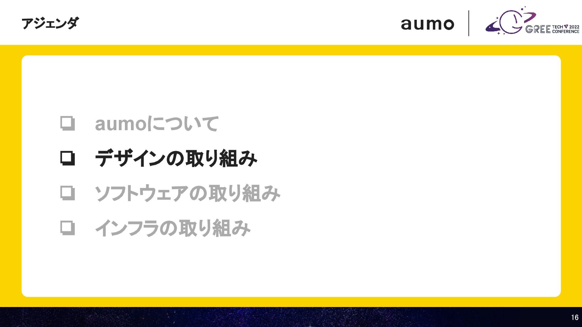 16 16 アジェンダ ❏ aumoについて ❏ デザインの取り組み ❏ ソフトウェアの取り組み ❏