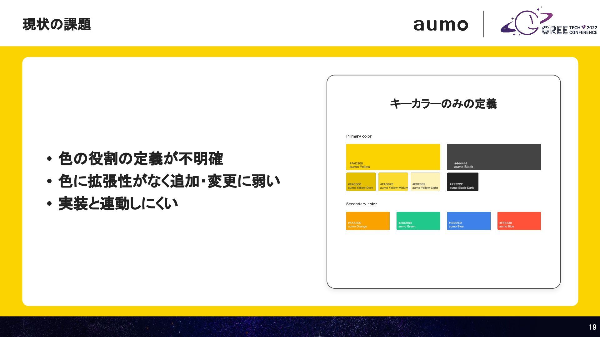 19 19 • 色の役割の定義が不明確 • 色に拡張性がなく追加・変更に弱い • 実装と連動しにくい 現状の課題 キーカラーのみの定義