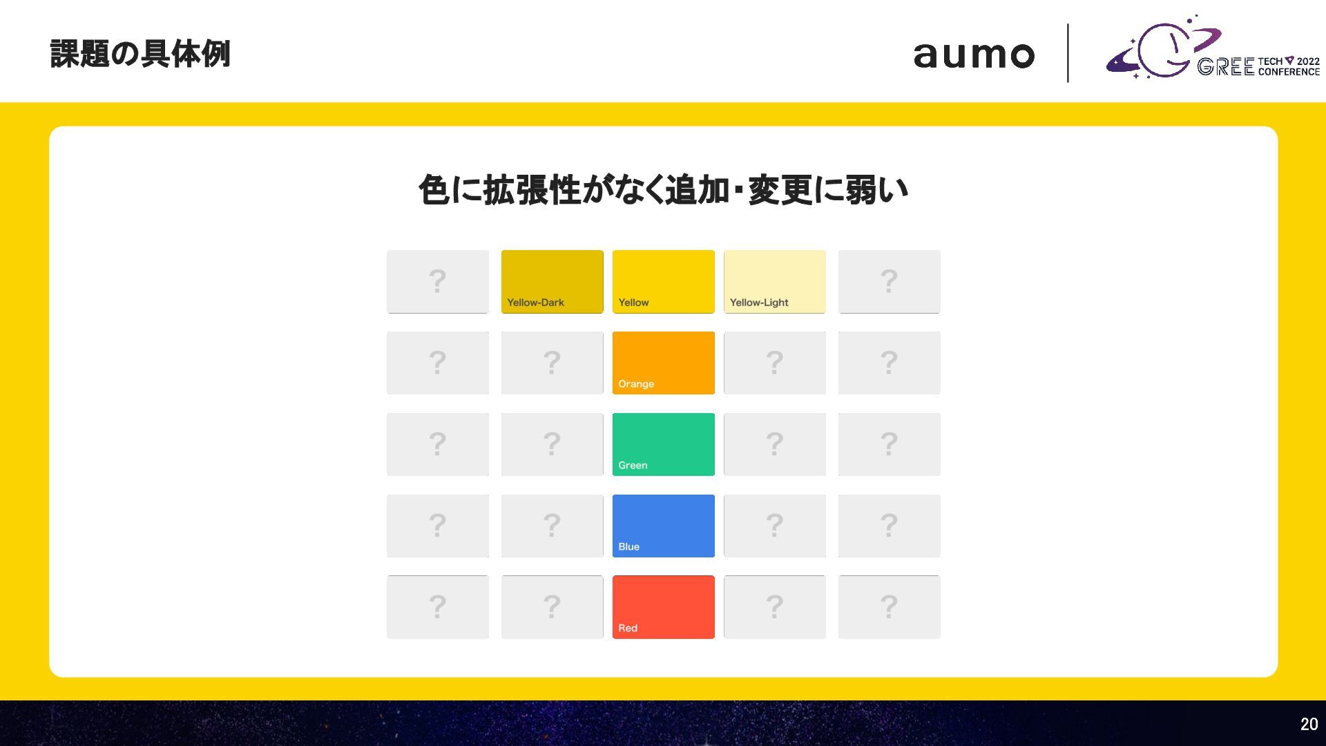 20 20 課題の具体例 色に拡張性がなく追加・変更に弱い