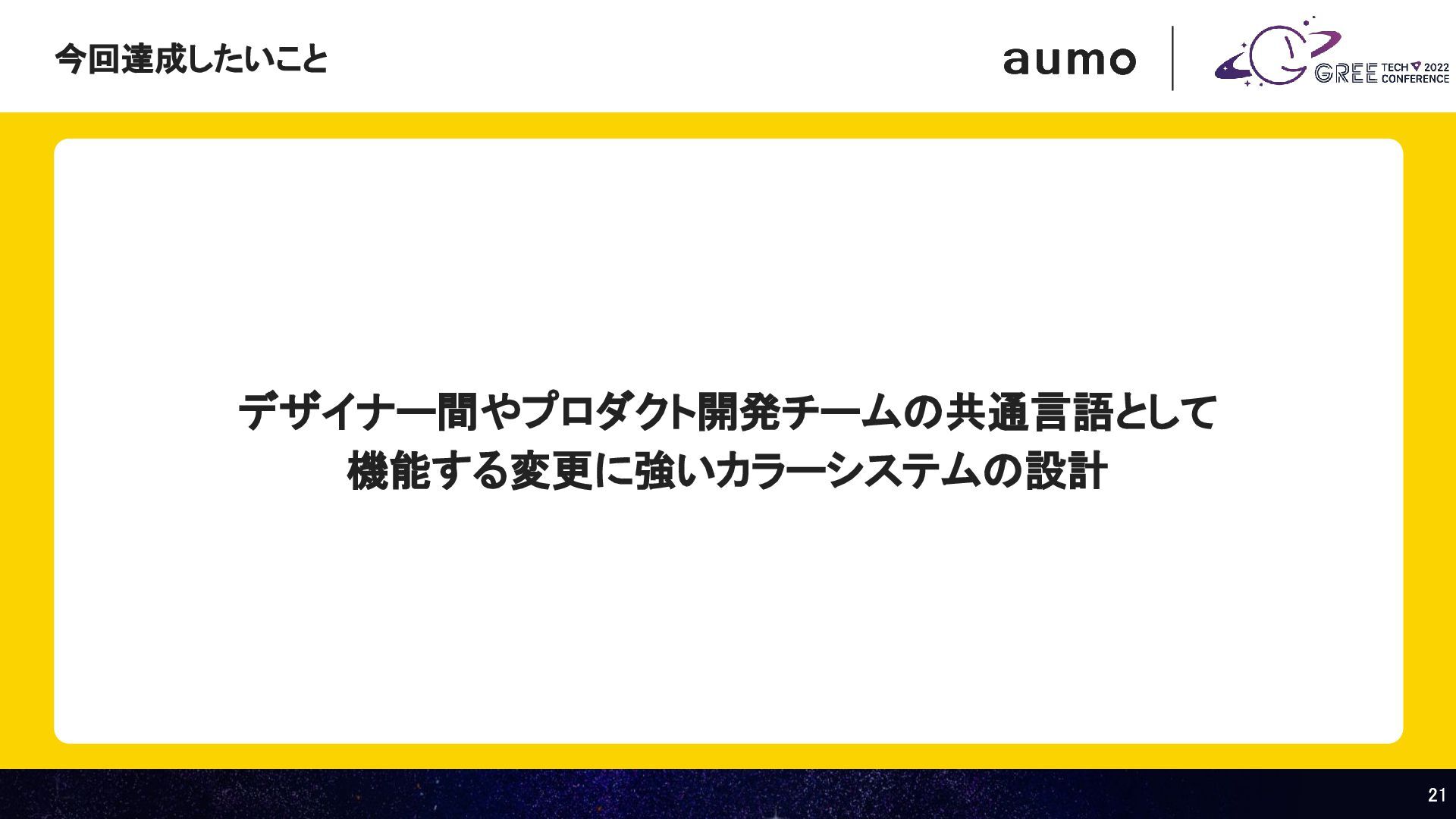 21 21 デザイナー間やプロダクト開発チームの共通言語として 機能する変更に強いカラーシステムの設計 今回達成したいこと