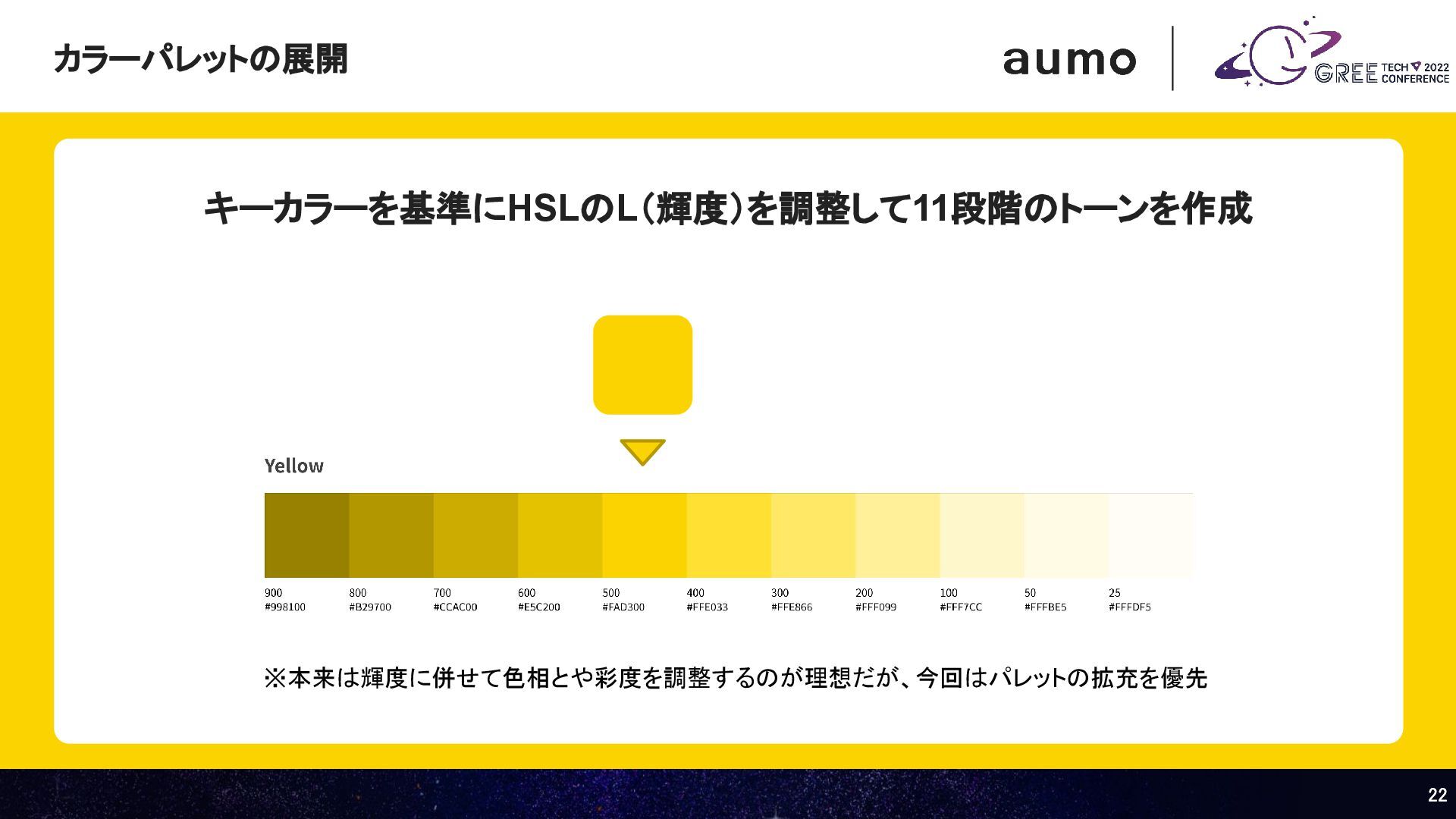 22 22 キーカラーを基準にHSLのL(輝度)を調整して11段階のトーンを作成 ※本来は輝度に併せて色相とや彩度を調整するのが理想だが、今回はパレットの拡充を優先 カラーパレットの展開