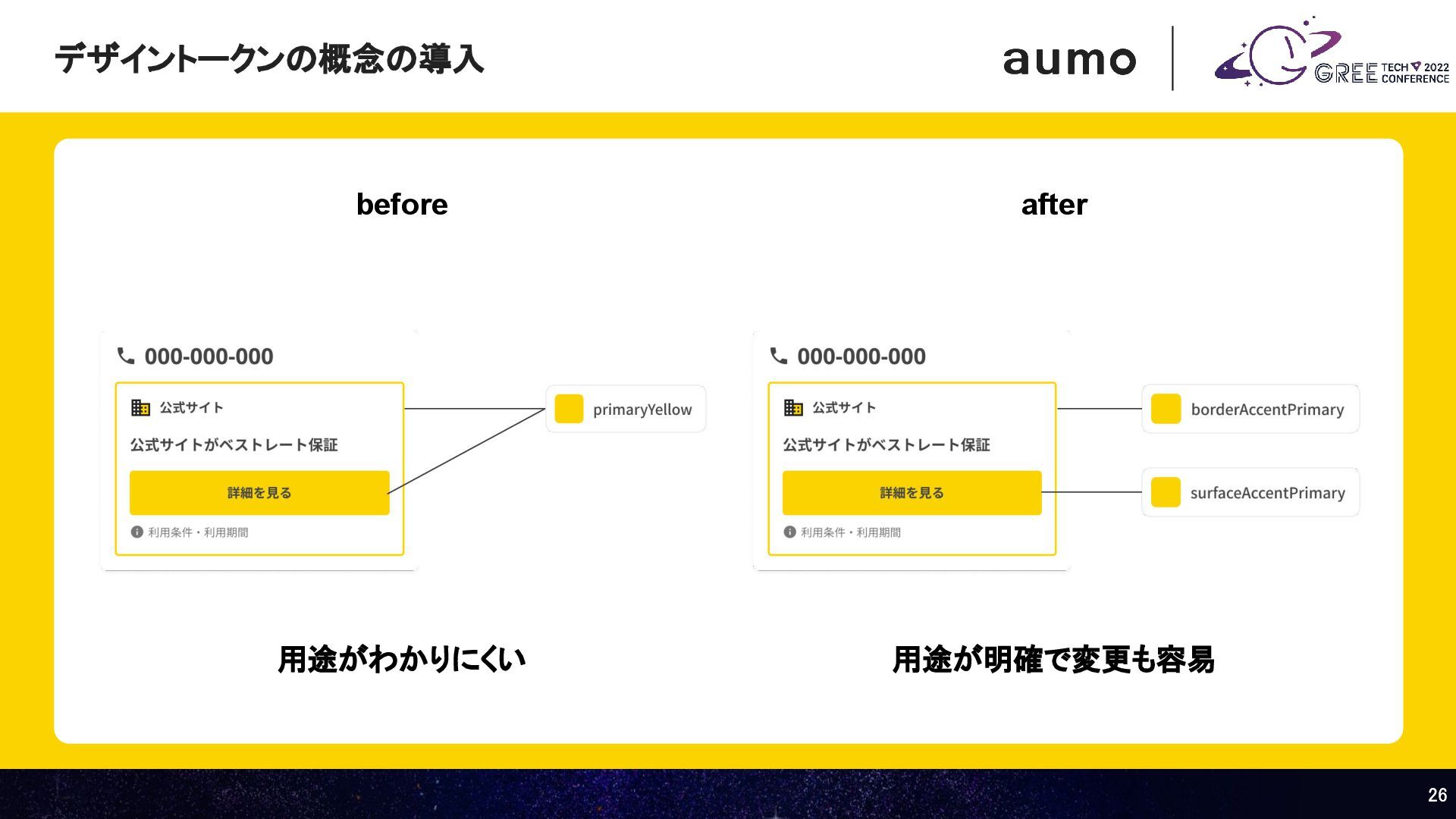 26 26 before after 用途がわかりにくい 用途が明確で変更も容易 デザイントークンの概念の導入