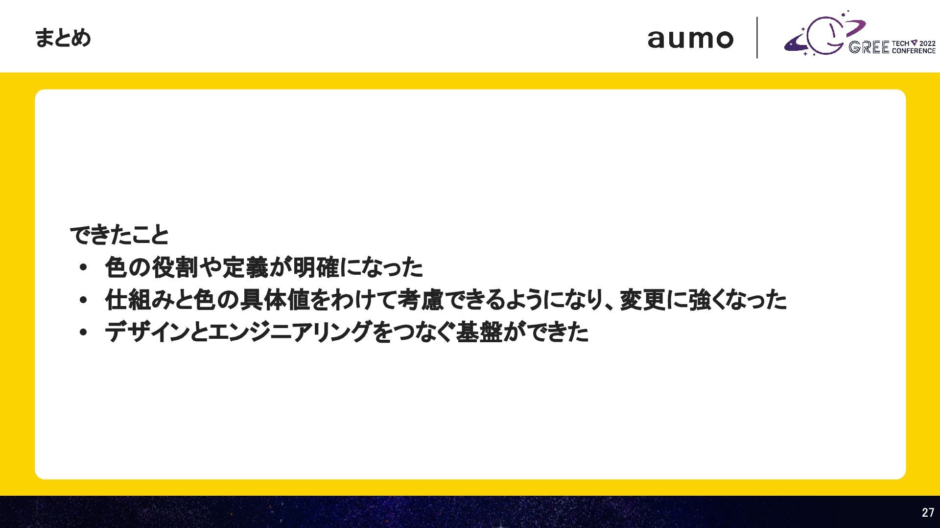 27 27 できたこと • 色の役割や定義が明確になった • 仕組みと色の具体値をわけて考慮できるようになり、変更に強くなった • デザインとエンジニアリングをつなぐ基盤ができた まとめ