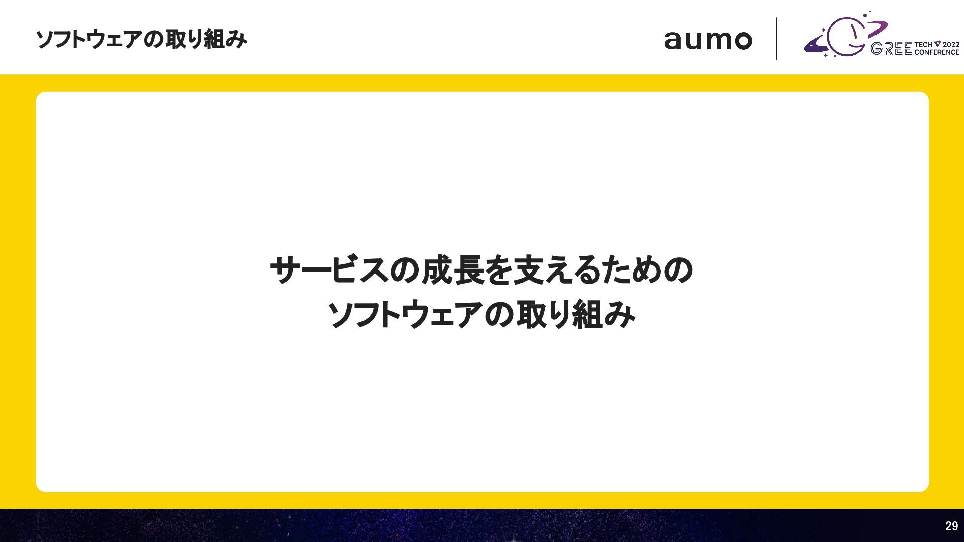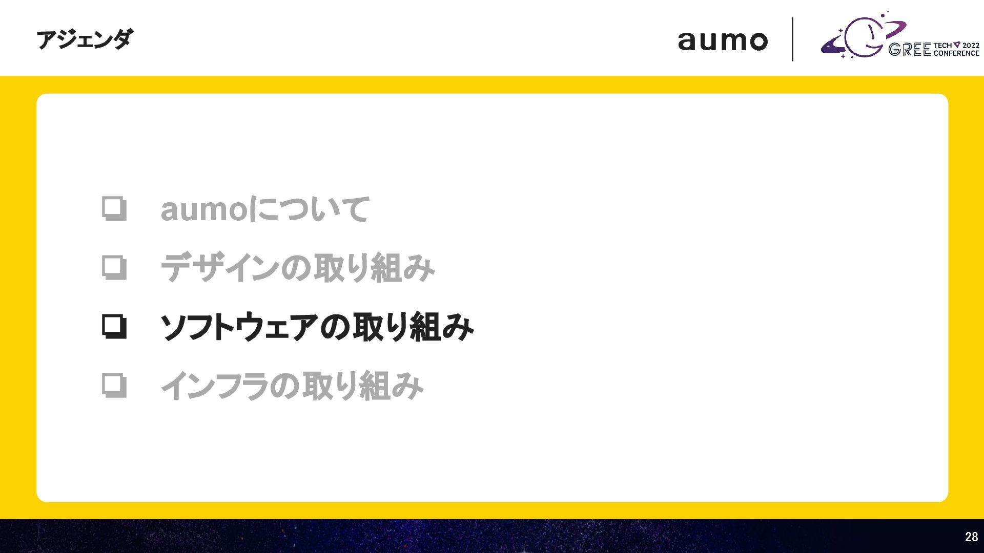 28 28 ❏ aumoについて ❏ デザインの取り組み ❏ ソフトウェアの取り組み ❏ インフラの取り組み