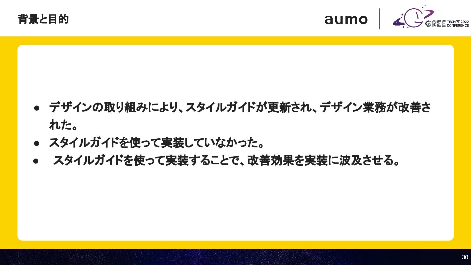 30 30 • デザインの取り組みにより、スタイルガイドが更新され、デザイン業務が改善さ れた。 • スタイルガイドを使って実装していなかった。 • スタイルガイドを使って実装することで、改善効果を実装に波及させる。 背景と目的