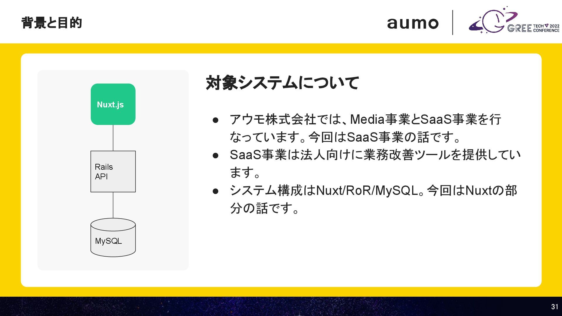 31 31 背景と目的 • アウモ株式会社では、Media事業とSaaS事業を行 なっています。今回はSaaS事業の話です。 • SaaS事業は法人向けに業務改善ツールを提供してい ます。 •