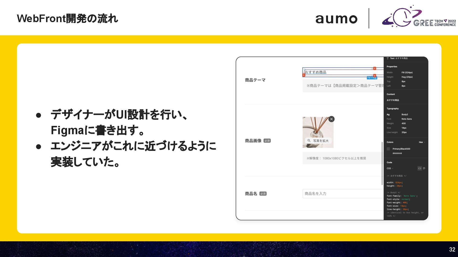 32 • デザイナーがUI設計を行い、 Figmaに書き出す。 • エンジニアがこれに近づけるように 実装していた。 32 WebFront開発の流れ