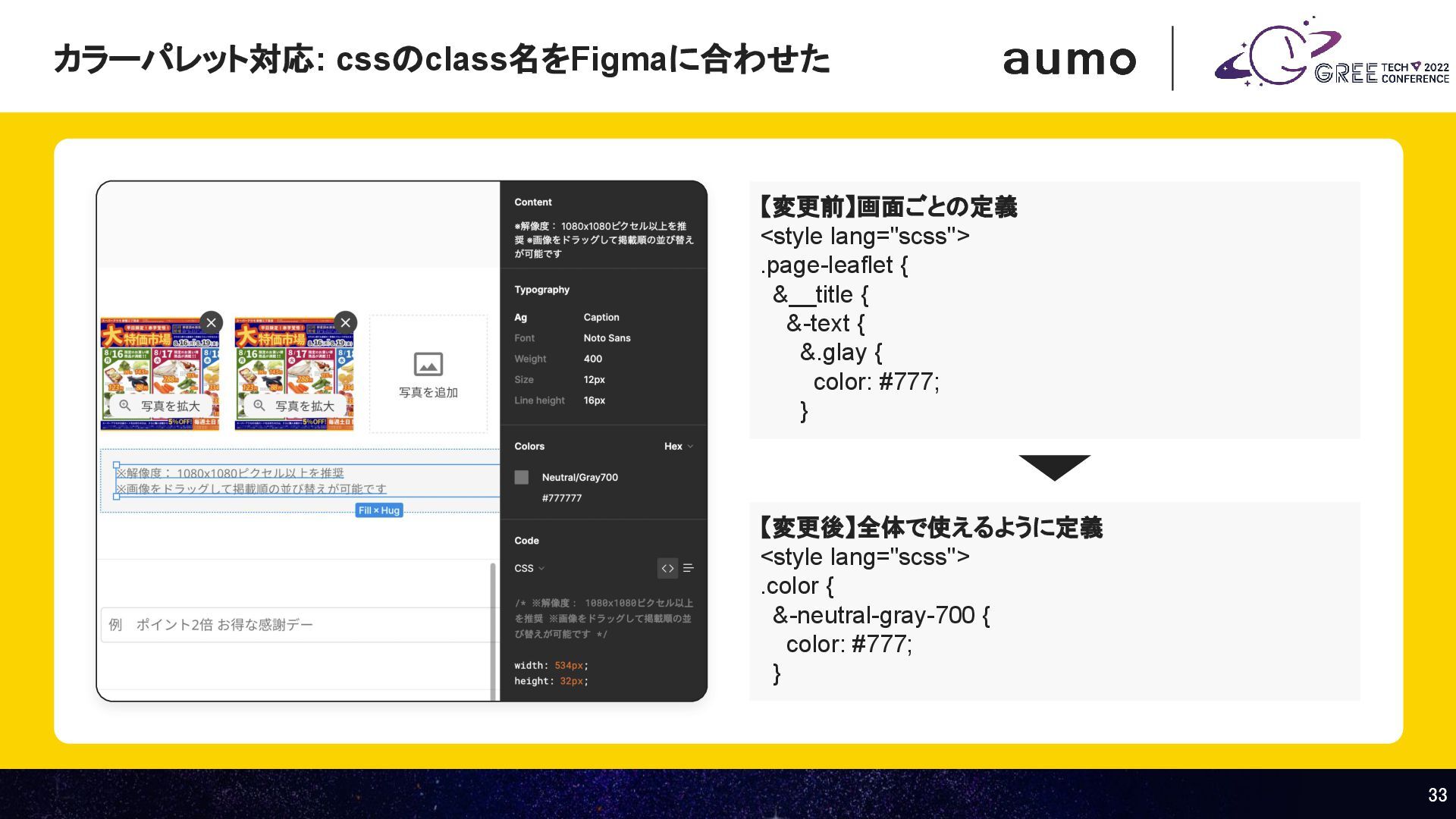 { &.glay { color: #777; } 【変更後】全体で使えるように定義 <style lang="scss"> .color { &-neutral-gray-700 { color: #777; } カラーパレット対応: cssのclass名をFigmaに合わせた