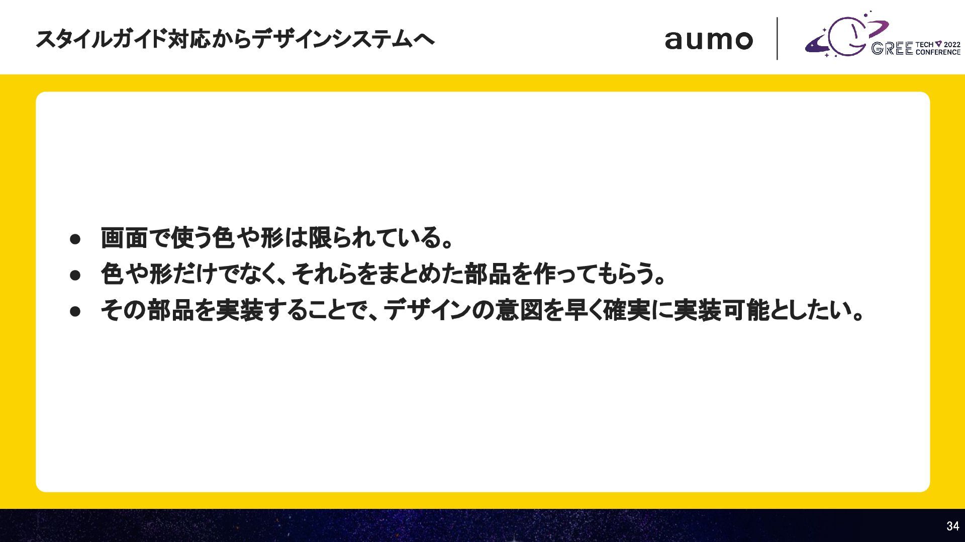 34 34 • 画面で使う色や形は限られている。 • 色や形だけでなく、それらをまとめた部品を作ってもらう。 • その部品を実装することで、デザインの意図を早く確実に実装可能としたい。 スタイルガイド対応からデザインシステムへ