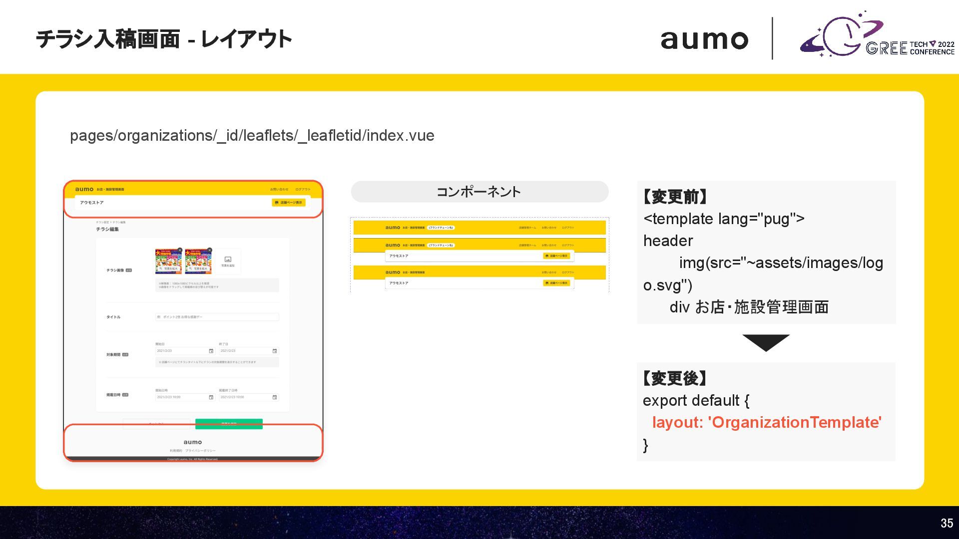 【変更前】 <template lang="pug"> header img(src="~assets/images/log o.svg") div お店・施設管理画面 チラシ入稿画面 - レイアウト コンポーネント