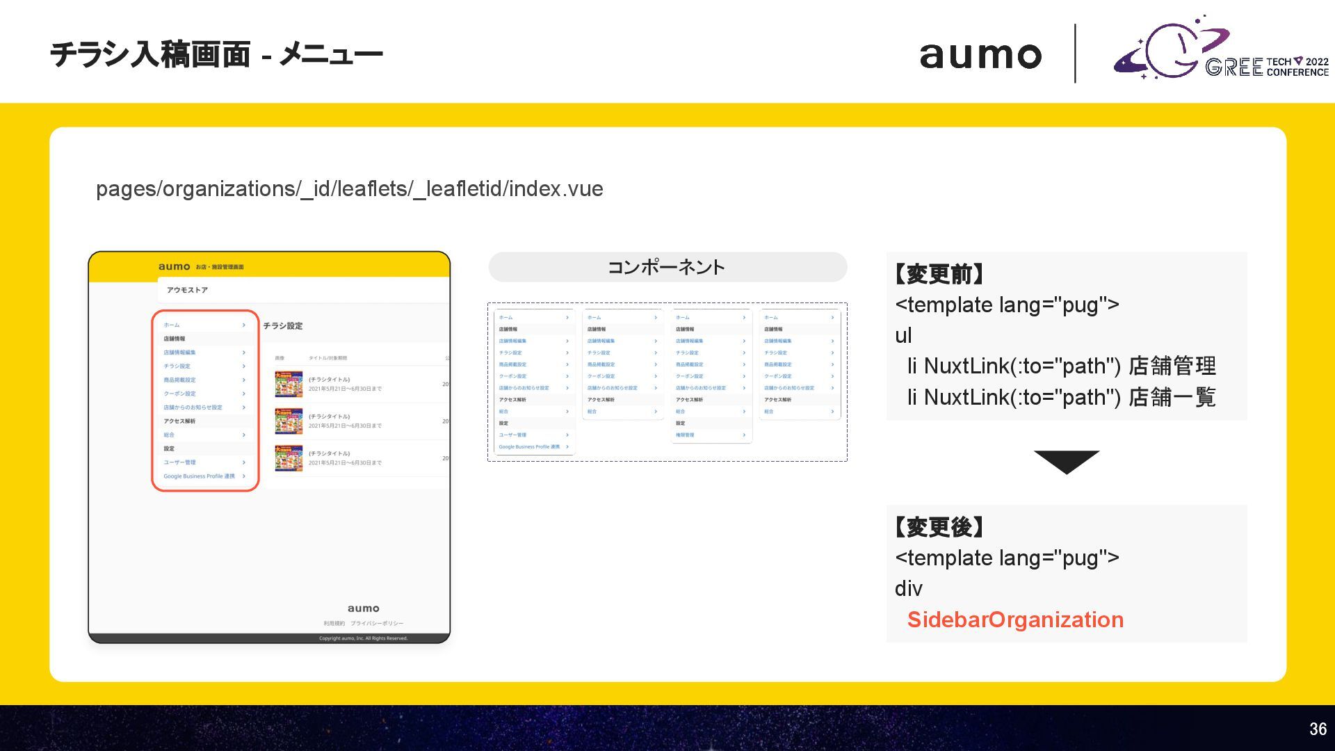 36 36 pages/organizations/_id/leaflets/_leafletid/index.vue 【変更後】 <template lang="pug"> div SidebarOrganization 【変更前】 <template
