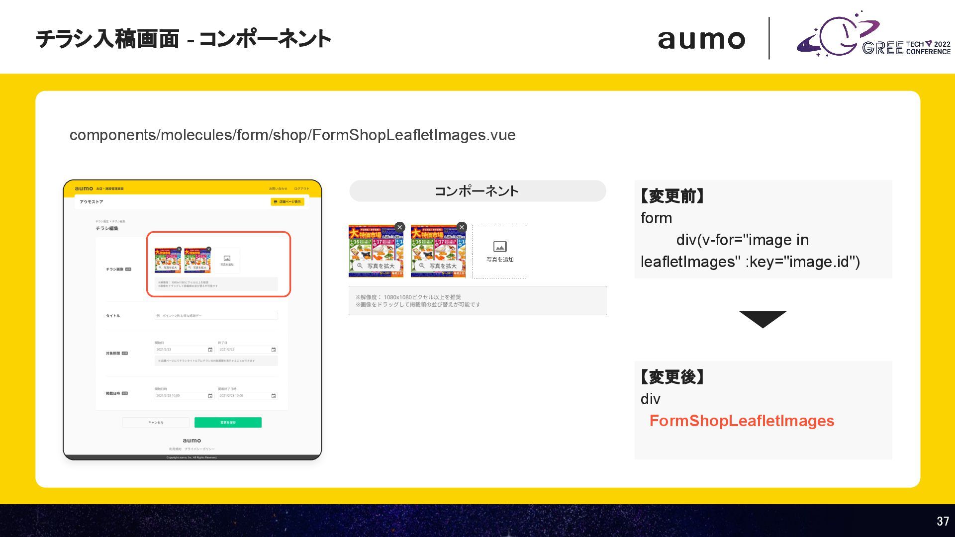 37 components/molecules/form/shop/FormShopLeafletImages.vue 【変更後】 div FormShopLeafletImages 37 【変更前】 form div(v-for="image in